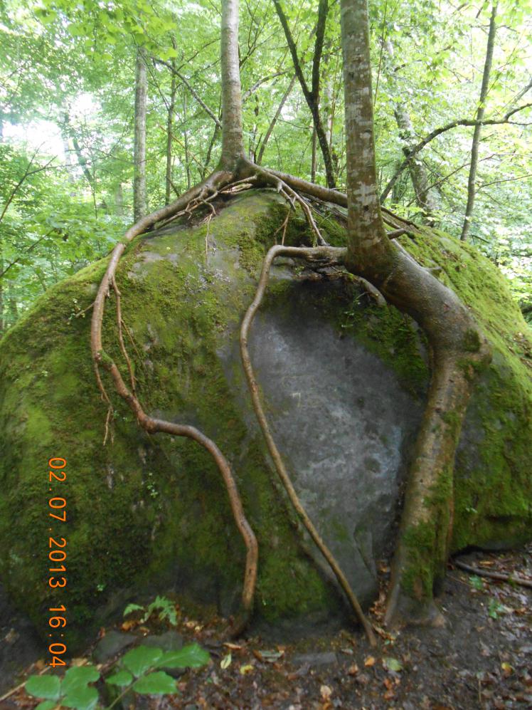 Двигаемся дальше. Тропинка постепенно огибает "сопку" — отрог высоты 1294 (она справа). Идём по часовой стрелке зигзагообразно с подъёмами и спусками по хорошо натоптанной тропе. Выходим на ровную заросшую лесом местность с огромными глыбами песчаника. Слева от тропы будет камень с растущим на нём деревом, корни которого спускаются вниз прямо по камню (ориентир). Хорошее место для отдыха. Ставим рюкзаки на камень. Делаем пару снимков на память))) До этого места идти приблизительно 1200-1500 метров.