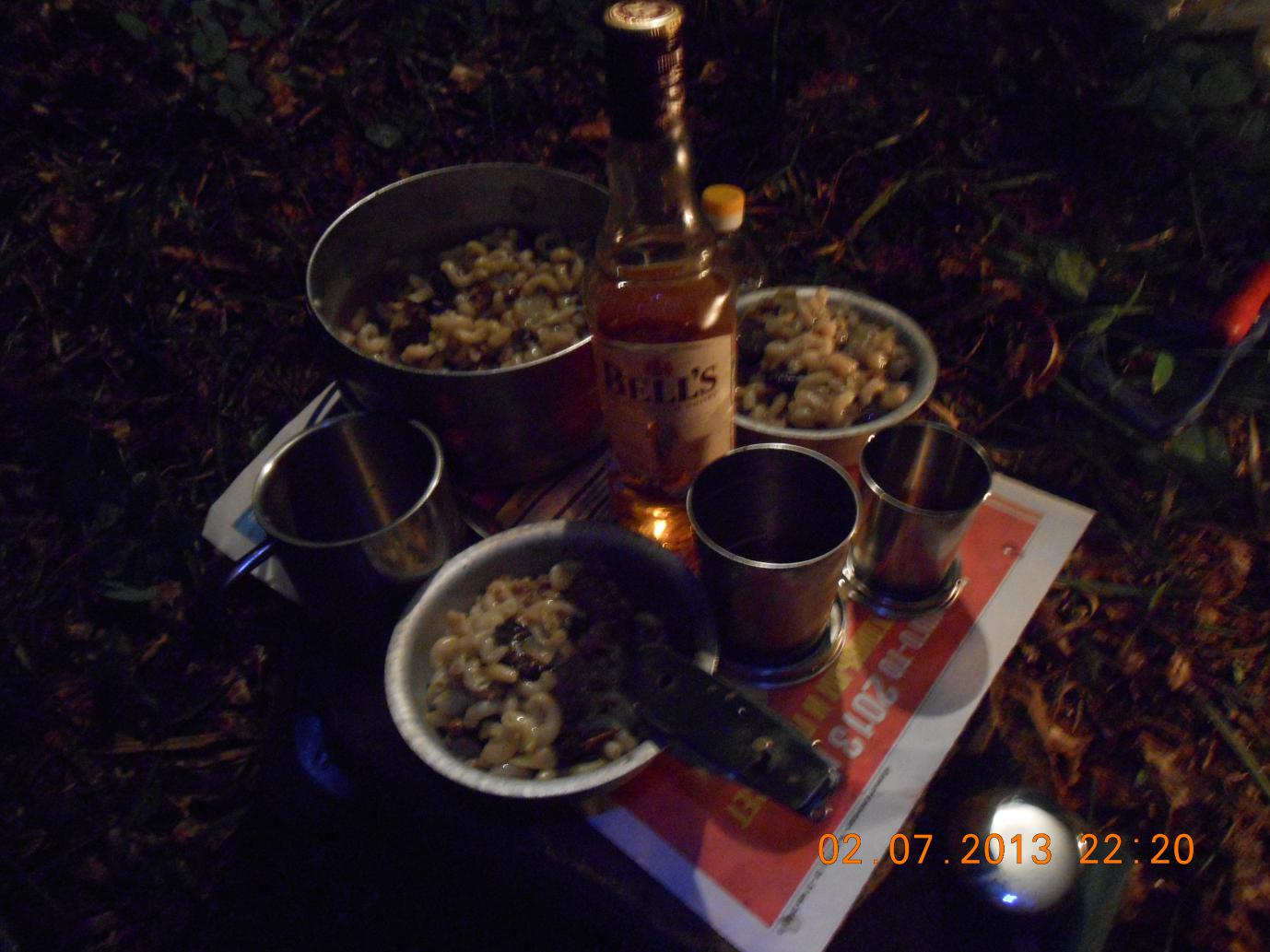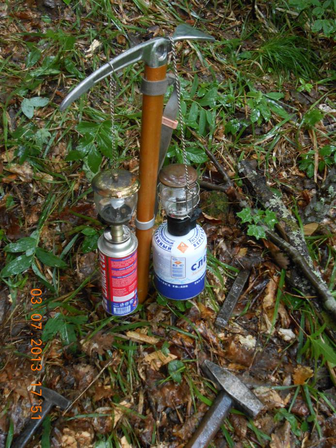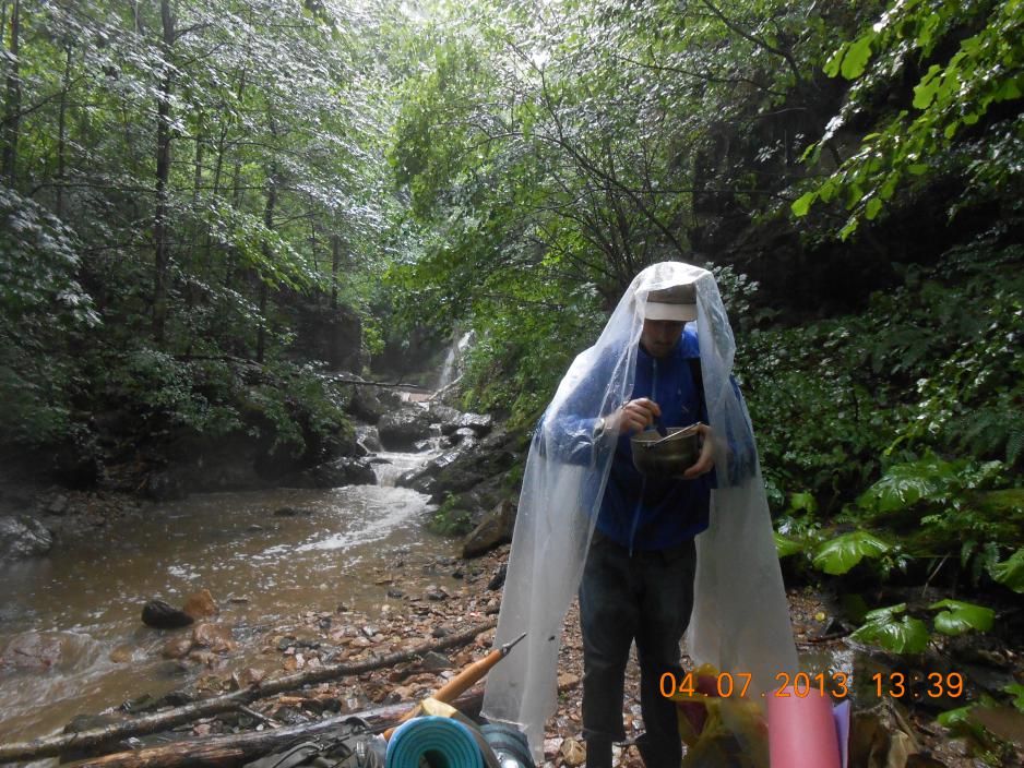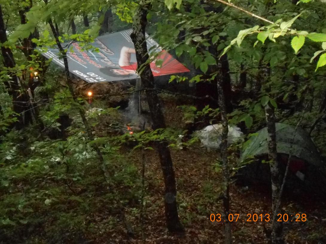 Я сапёрной лопаткой и киркой выровнял место для костра, натаскал камней, соорудил из них очень приличный очаг. Костёр уже начал разгораться, но мешал проливной дождь. Дима достал большой "баннер" с какой-то певицей и на резинках-растяжках мы его натянули между деревьев высоко над костром. Получился навес. На угол в месте слива воды повесили котелок. Проблема воды была решена сходу. Ёмкости 5 л, 2 л и все остальные заполнены, воды — хоть залейся))) Стало темнеть, объявились два газовых фонаря с очень ярким светом. Жить стало веселее.))) Потом попробовали связь, Билайн — без проблем. Звони куда хочешь. Правда, только с одного пяточка (дальше связь теряется). Свой МТС я не проверял.