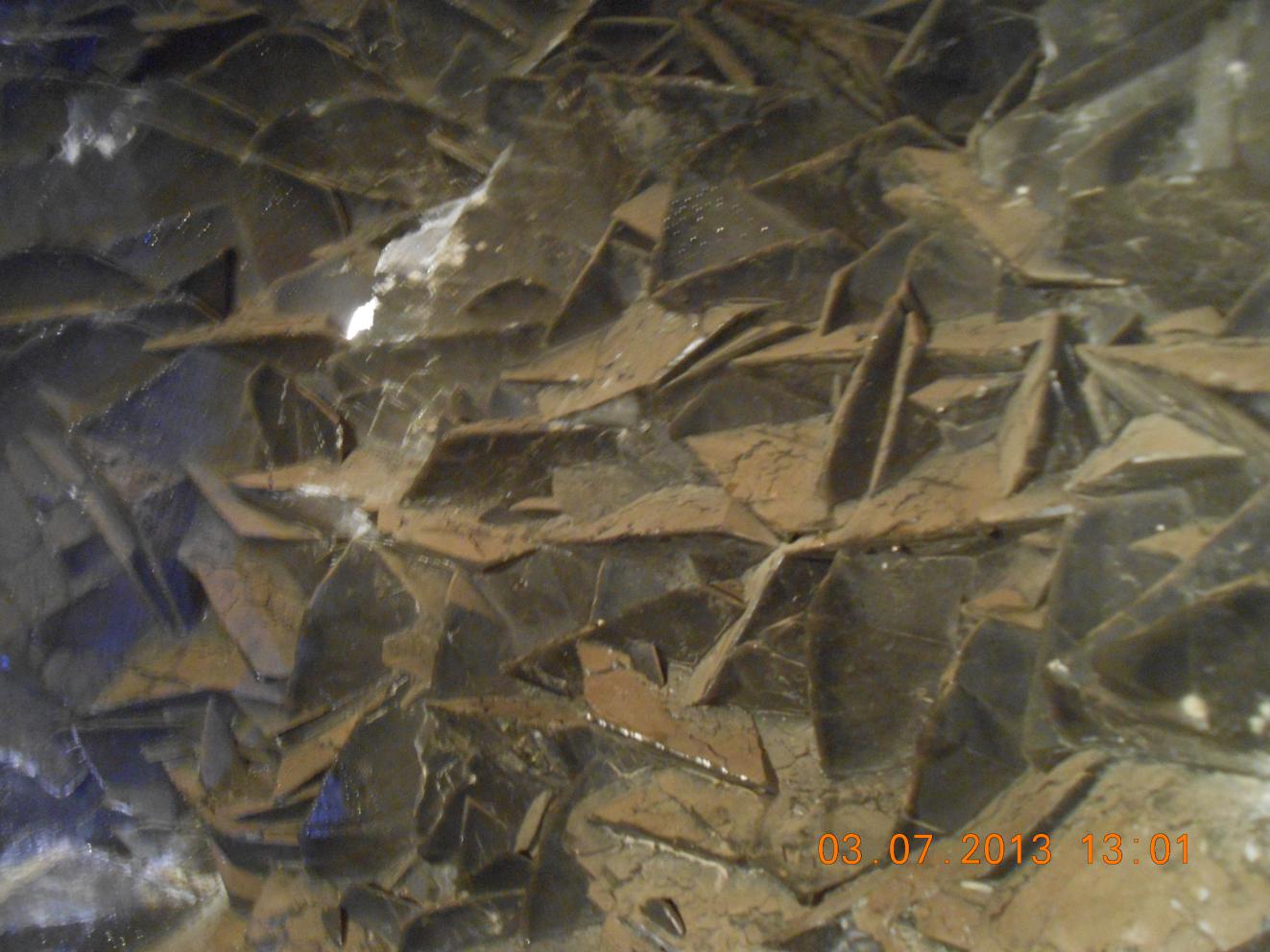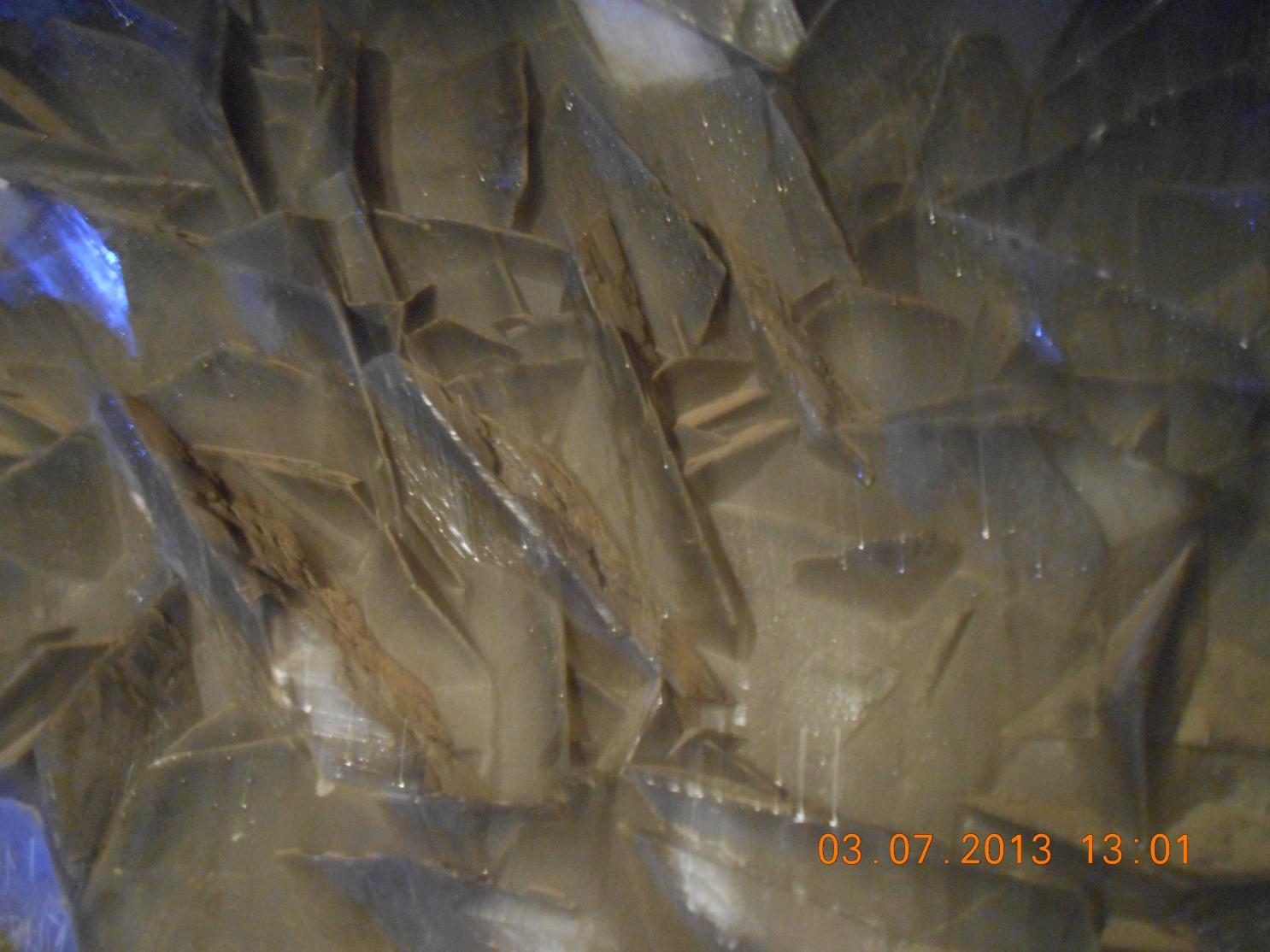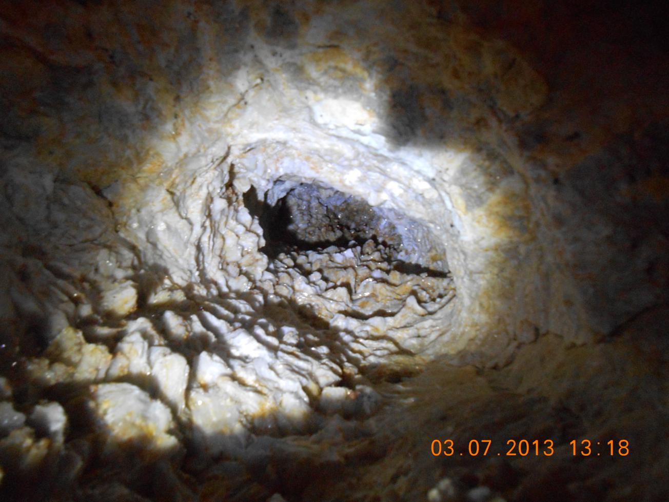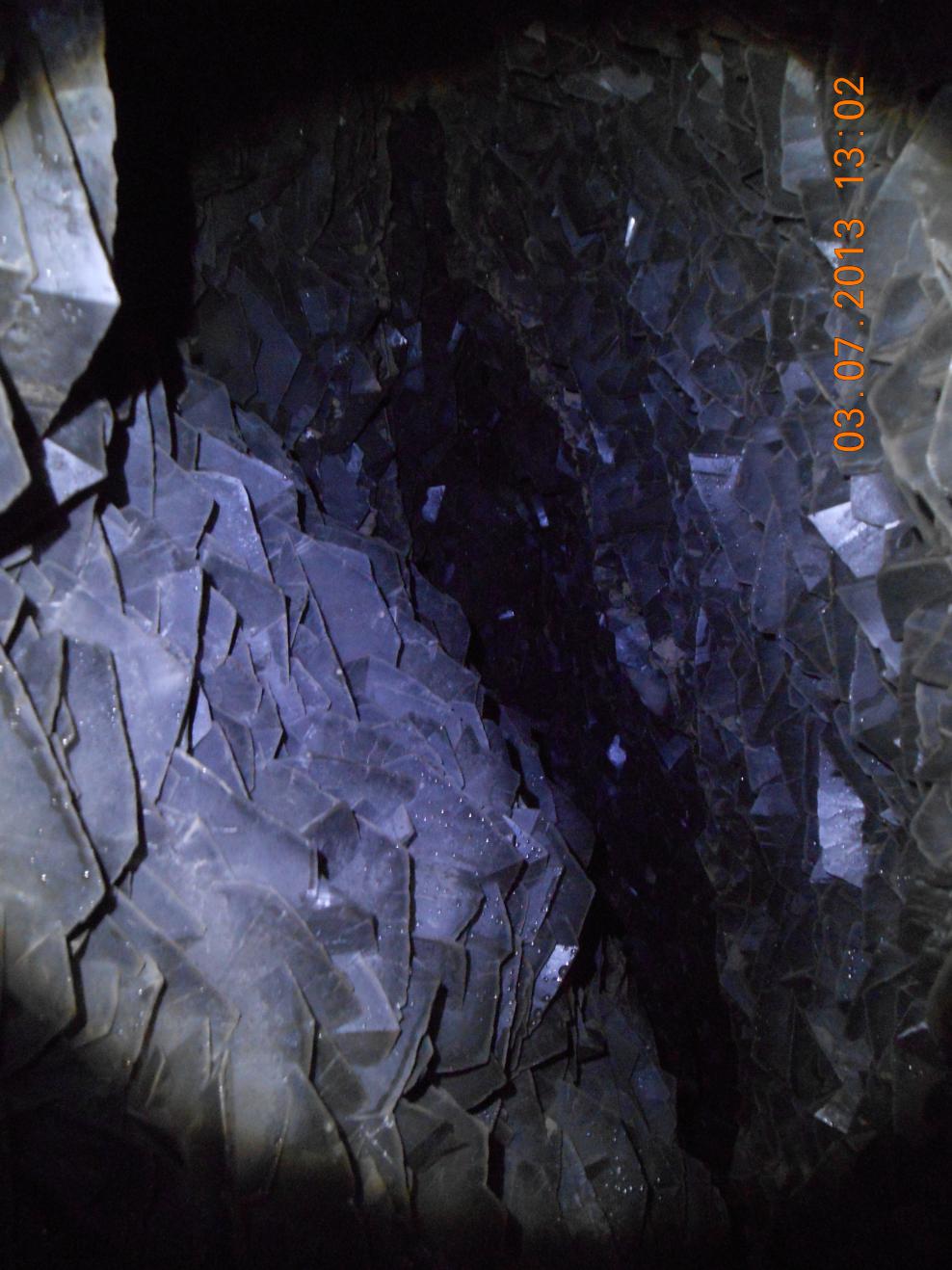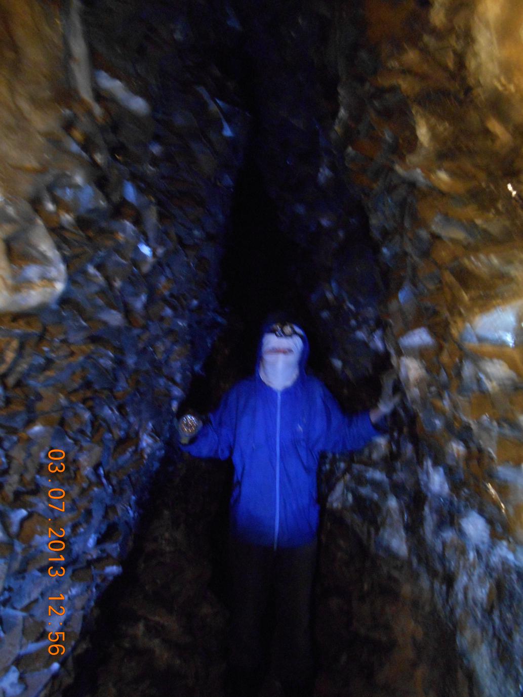 И вот слева кальцитовый "дутыш" — зрелище потрясающее, но сильно обезображенное варварами, мародёрами и браконьерами от геологии... Зачем портить такую красоту? Выламывать, выпиливать кристаллы кальцита, это же не драгоценный камень, а всего лишь карбонат кальция. Очень жалко. Прямо разочарован. Туда бы металлическую решётку приварить, чтобы не лазали, а только смотрели, ведь по сути дела — это памятник природы. Кстати, если аккуратно поковырять утоптанный грунт в проходе дутыша, то наверняка вы там найдёте несколько образцов себе в коллекцию. Мы для этого использовали маленький металлический совок-лопатку.
