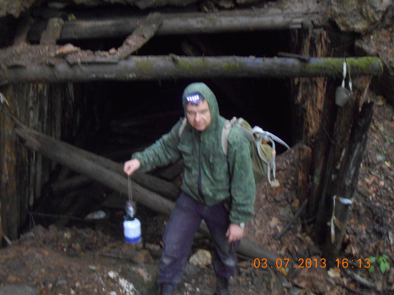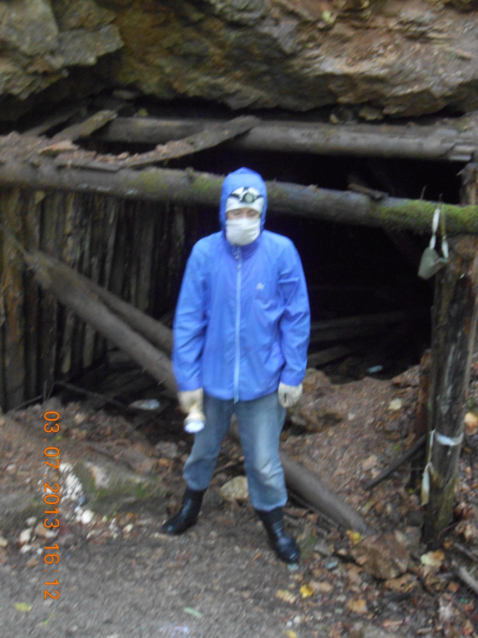 Перекусили остатками ужина и к двенадцати направились в штольню. Снова начался дождь, как по расписанию. Перед входом всё проверили, включили фонари и — вперёд. Когда выезжал из Краснодара, то, кроме горных ботинок, взял резиновые полусапоги. И они спасли мои ноги от сырости, а также пригодились первые сто метров на входе. Гельмут пошёл в "берцах" и шёл по брёвнам и шпалам, обходя воду. Ног не замочил.)))
