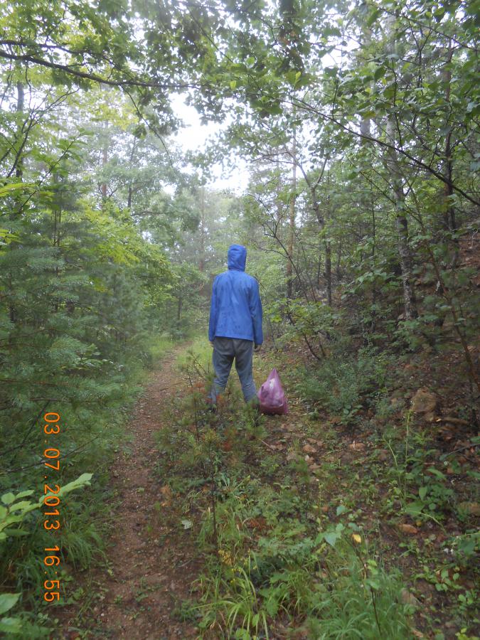 Резиновые полусапоги я взял как сменную обувь для похода в штольню, но за три дня дождей я из них практически не вылезал, пригодились они и в этот раз. Местами каменистая, местами глинистая тропинка под проливным дождём на отдельных участках напоминала ручей, по которому мы из-за груза камней медленно ползли вниз, как две черепахи. При том что в 15-30 нам уже нужно будет стоять на дороге возле базы, чтобы не пропустиь последний автобус из Гузерипля на Майкоп. И если мы его пропустим, возникнут проблемы.))) Увеличить скорость мы не могли — ну, не бросать же камни на тропинке. Тут и так, пока идёшь с базы до штольни, на тропе можно собрать небольшую коллекцию. Один что-то бросил, другой бросил — в итоге сами понимаете! Но брать образцы с тропы не рекомендую: свои-то я знаю откуда, а вот откуда чужие, сие мне неведомо.))) Будут вам "светить", как новогодняя ёлка в зимнюю ночь, мягким урановым светом...)))