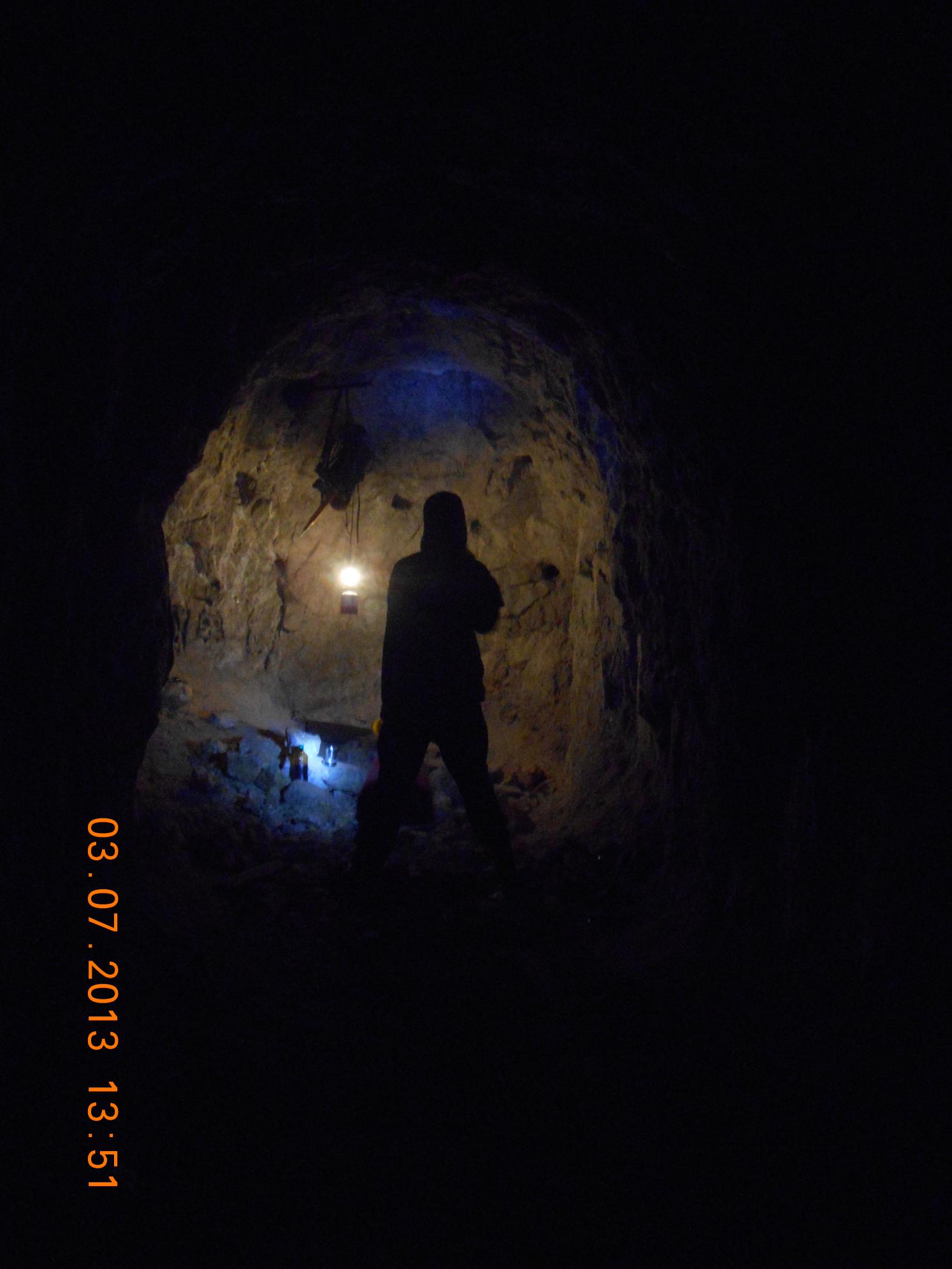 У нас с собой были кирка-ледоруб, три молотка, железный совок, зубило, газовый фонарь и что-то ещё, не считая фонарей и налобных фонариков. Пока шли первые сто метров, казалось прохладно, но потом, в глубине горы, стало теплее. Видимо, "хозяйка медной горы" пожалела бедолаг.)))