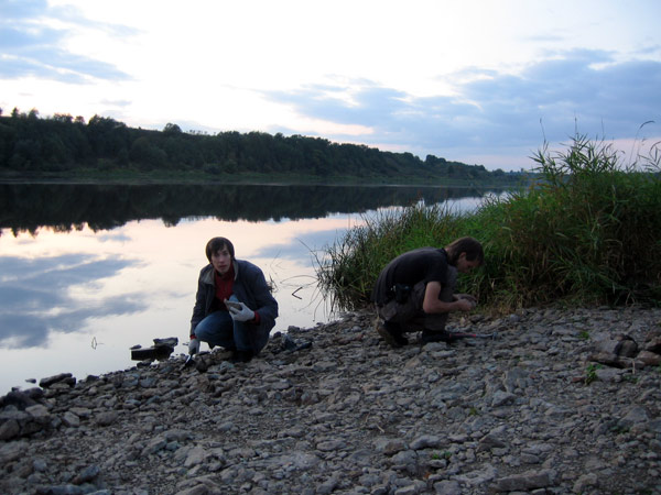 Сегодня добрались до реки Волхов. Начали поиск трилобитов, но уже поздно, поэтому организовали ночлег на берегу реки. Василий до сих пор ходит с фонариком, пытается найти своего лучшего трилобита))