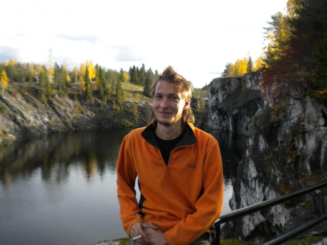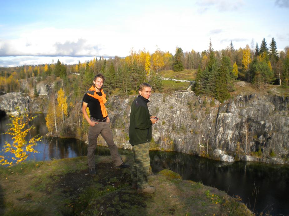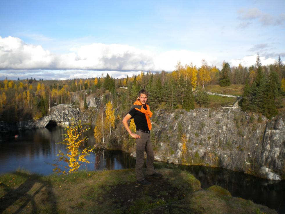 Левое ухо Arty на фоне одной из Рускеальских мраморных ломок — слева от официального въезда в парк. В метре за его спиной — обрыв.