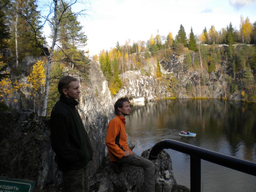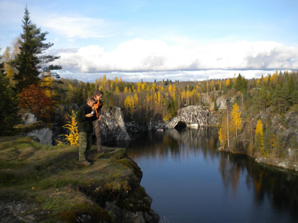 Этот большой затопленный карьер и есть парк Рускеала. По периметру карьера водят экскурсии. По воде катаются на лодках. На лодках можно попасть в полузатопленные штольни.