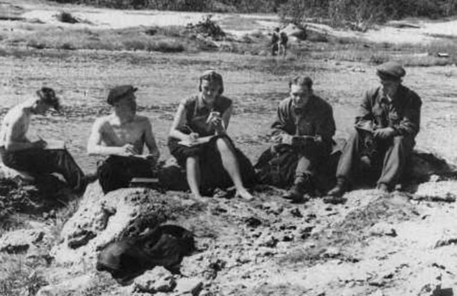 Практика студентов геолого-разведочного факультета Карело-Финского государственного университета на берегу реки Саблинка, 1955 год, руководитель практики В.М. Рейман (курсы геоморфологии и биостратиграфии).