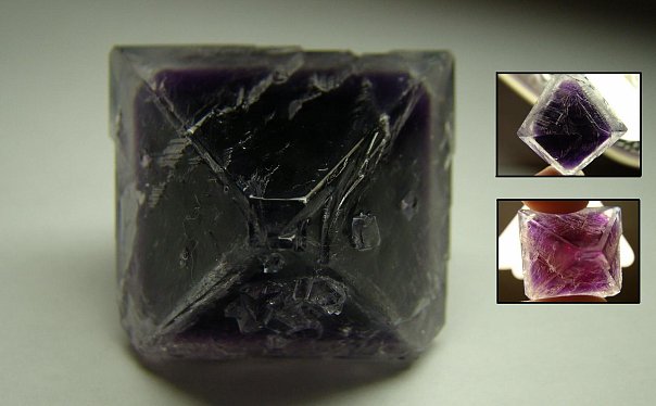 Я лично знаю потрясающий пример Плеохроизма в Искуственных минералах это у смеси Алюмокалиевых и Хромокалиевых квасцов, они имеют цвет разный при разном освещении (на данных фото используются свет лампы накаливания и галогеновой лампы-дневного света).