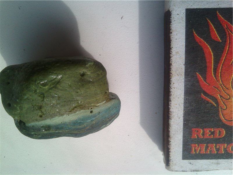 Знакомая попросила определить, что за камень ей подарили. Очень похоже на яшму, да и найден был на берегу Черного моря (точнее информации нет). Но удивляет другое - камень как будто бы склеен из двух частей: одна зеленая, вторая синяя. Причем синяя часть по градиенту от темного до светло-голубого. Также имеются два вкрапления похожих на кварц.