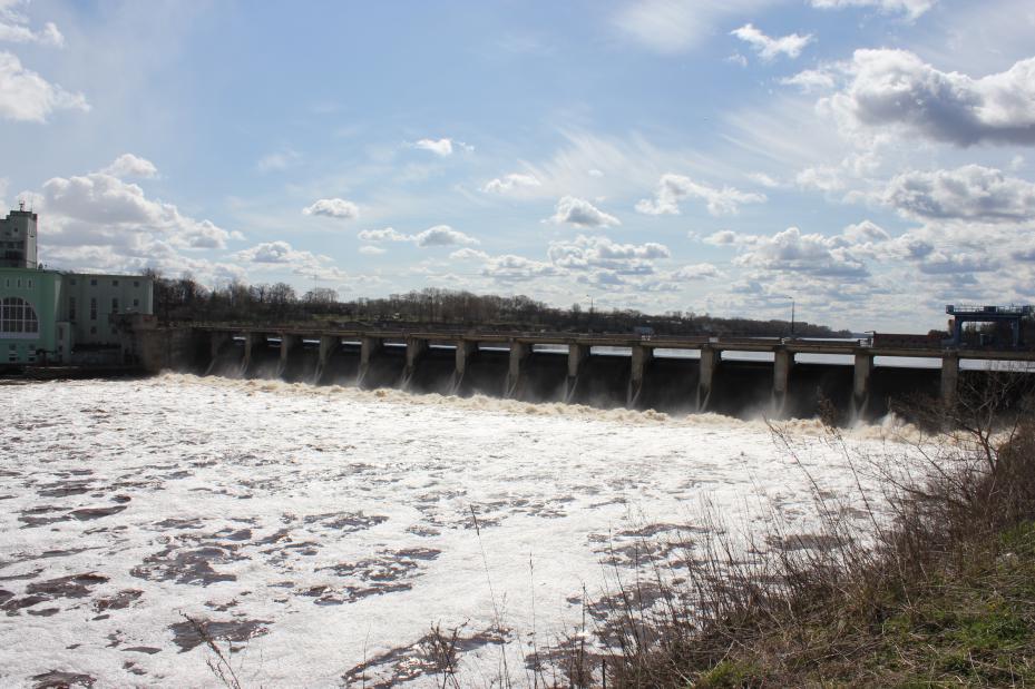 А вот и сама ГЭС на реке Волхов. Еще при подъезде к плотине слышен сильный шум падающей воды и чувствуется запах свежести в воздухе. Довольно интересное место. Можно часами смотреть как падает вода, образуя при этом густую белую пену, плывущую дальше по течению.