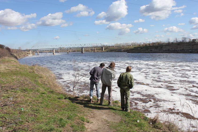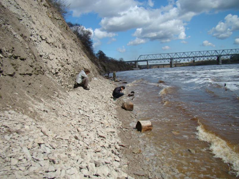 Берег реки сильно затапливает в весенний разлив, но нам удалось найти свободные от воды участки. Тут в аллювиально-коллювиальных отложениях мергелей Ордовикского периода, Палеозойской эры, как выражается любитель-палеонтолог Василий, "обитают трилобиты"