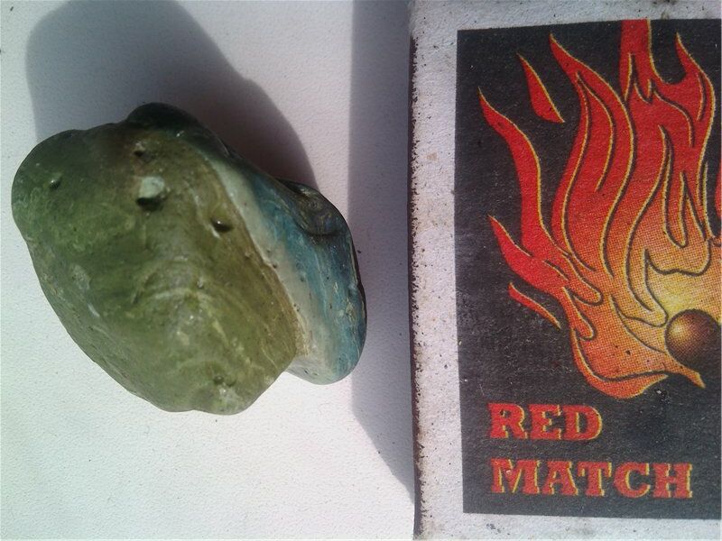 Знакомая попросила определить, что за камень ей подарили. Очень похоже на яшму, да и найден был на берегу Черного моря (точнее информации нет). Но удивляет другое - камень как будто бы склеен из двух частей: одна зеленая, вторая синяя. Причем синяя часть по градиенту от темного до светло-голубого. Также имеются два вкрапления похожих на кварц.