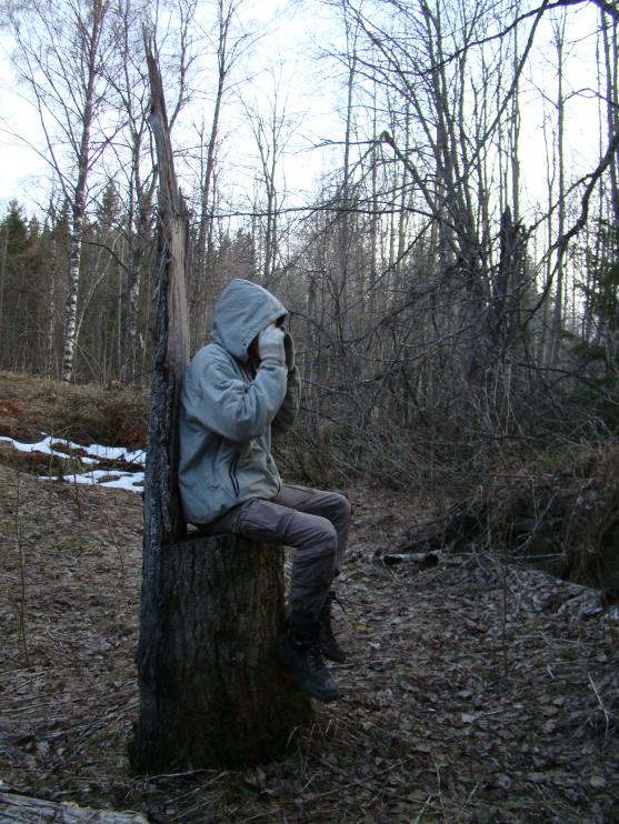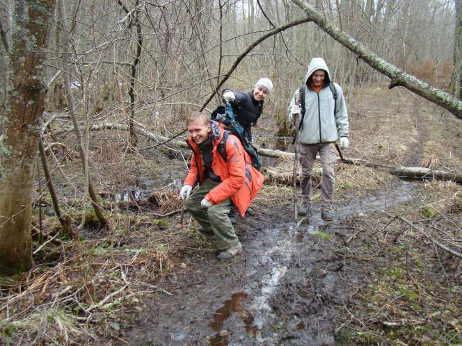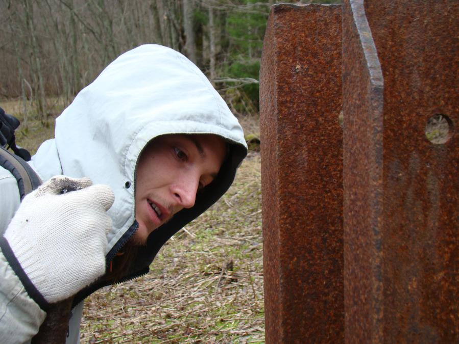 Далее, вооружившись автомобильным навигатором, благодаря которому мы чуть было не остались ночевать в лесу, продолжаем маршрут пешком. После долгих и безрезультатных плутаний по карельскому, местами заболоченному лесу, принимаем решение отказаться от современного чуда техники, а чётко следовать указаниям Игоря Борисова и идти по тем ориентирам, которые он нам указал в собственноручно нарисованной карте (ручей, железный столб, развалины обогатительной фабрики, насыпи, УЗКОКОЛЕЙКА, карьер). Мы чувствовали себя кладоискателями. Начинало потихоньку смеркаться, а узкоколейки и карьера всё не было. Фонарей у нас тоже не оказалось, потому что планировали только посмотреть, а утром вернуться вновь.