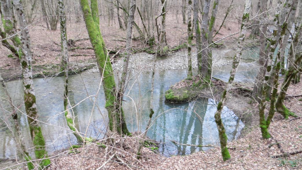 Дорога постепенно набирает высоту. Долины или, как их здесь часто обозначают на картах, "щели" изрезаны сетью рек и ручьёв, которые относятся к бассейну той или иной более-менее крупной реки. Мы прошли Семёновскую щель и в нужном месте повернули к броду через очередную реку. В данном случае вся речная сеть вокруг нас — это бассейн реки Псекупс. Горные породы там имеют осадочное происходжение (Верхний мел). Породы в долине реки по составу карбонатные. Изредка встречаются куски кварца и кварцита. Далее идём по размытой горной дороге, слева от нас несёт свои воды река Аюк.