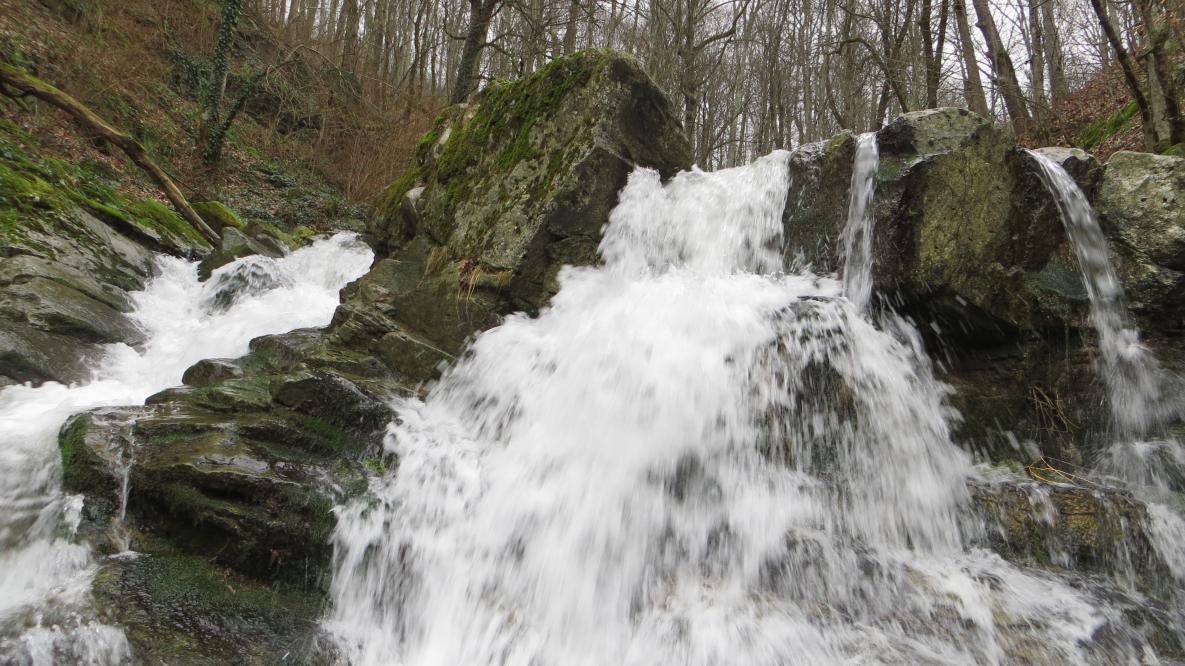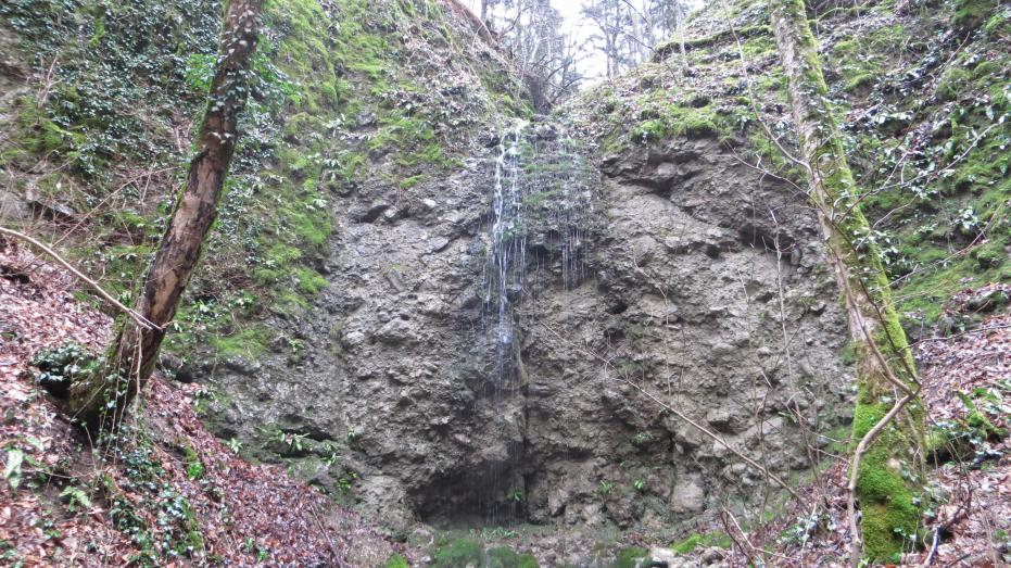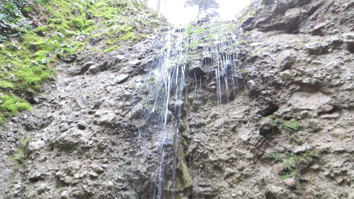 Справа от водопада останавливаемся на отдых. Видна стена массивных скальных обнажений, от влаги поросших мхом. Пласты как бы вывернуты изнутри и надвинуты друг на друга. Время, воздух и вода образовали между ними множество трещин. Это начальная основа для образования пещер.
