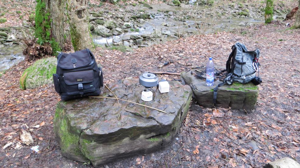 Перекусили, попили кофе. Пока Алексей варил кофе, я налегке в одиночку отправился изучать ущелье, но пройдя метров 70 вверх по ручью вернулся: споткнуышись, немного повредил ногу. Там бурелом, и сильно не разгонишься. Отдохнув и набравшись сил, отправились вдвоём вверх по ущелью, где-то там должен быть вход в пещеру, ту которую мы ищем...
