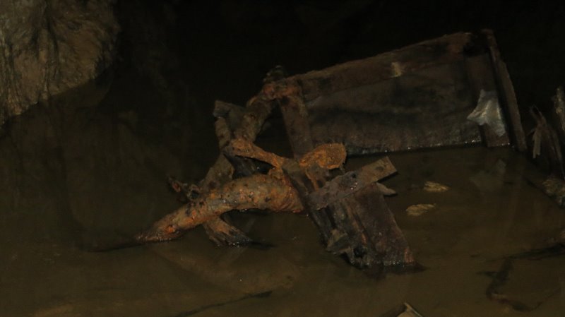 Мы перемещались по штольне достаточно быстро, не задерживаясь долго на одном месте. У нас в планах не было заниматься горными разработками, чтобы утащить всё содержимое штольни домой.))) Процесс познания тоже интересен, а потому мы задались целью обойти всю штольню, включая боковые ответвления, тупики и закоулки, пофотографировать и поснимать на видео. Что собственно мы и сделали. В начале третьего ночи наша программа была завершена, и мы двинулись к выходу. На обратном пути у выхода, там где вода, я промочил ноги, оступившись на скользком бревне. (Потом в лагере пришлось сушить обувь).