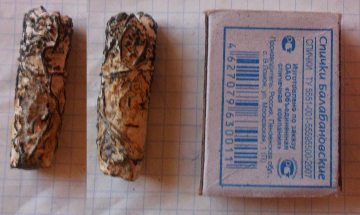 Эта штука только одна попалась. Внутри черноватого цвета. Снаружи совсем черная (белый цвет - забившийся мел, не стал удалять, чтобы лучше было все видно по контрасту). Похож на палочку, которую оплетают в разных направлениях некие нити