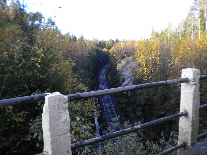 — Сейчас будет интересное место. Смотрели фильм “Тёмный мир”? Сейчас по обеим сторонам моста будет глубокая траншея прорубленная финнами для железной дороги прямо в скалах. Длина этой траншеи три километра. Здесь снимали фрагменты фильма “Тёмный мир”.