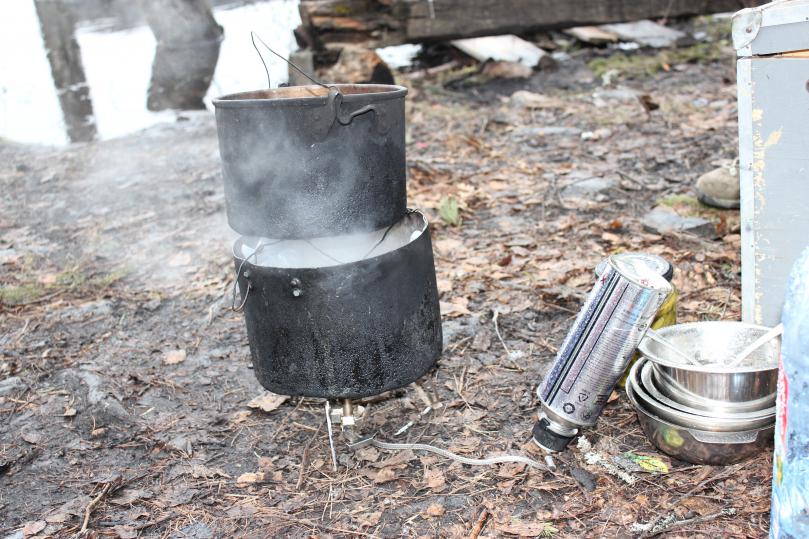 По пути на следующую точку маршрута (г. Сортавала, краеведческий музей) остановились на ночёвку на берегу Крестового озера. Озеро, тектонического происхождения, напоминает по форме крест. Дорога к озеру была сильно заснежена, наш тюнингованный вездеход, с блеском преодолевал вновь и вновь встававшие перед ним снежные препятствия. Почти всю ночь шёл дождь, поэтому утром, чтобы не терять время на разведение костра и сушку дров, мы воспользовались газовой горелкой, чтобы приготовить наивкуснейший завтрак: рис с тушёной говядиной, приправленный особой специей (по рецепту шеф-повара bluesroad).
