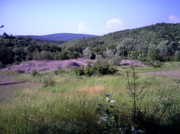 Вид на площадку с отработкой из штолен. То ли не вывезли в своё время, то ли содержание ртути показалось маленьким и бросили. Обратите внимание на цвет. Трава там тоже не очень растёт)))