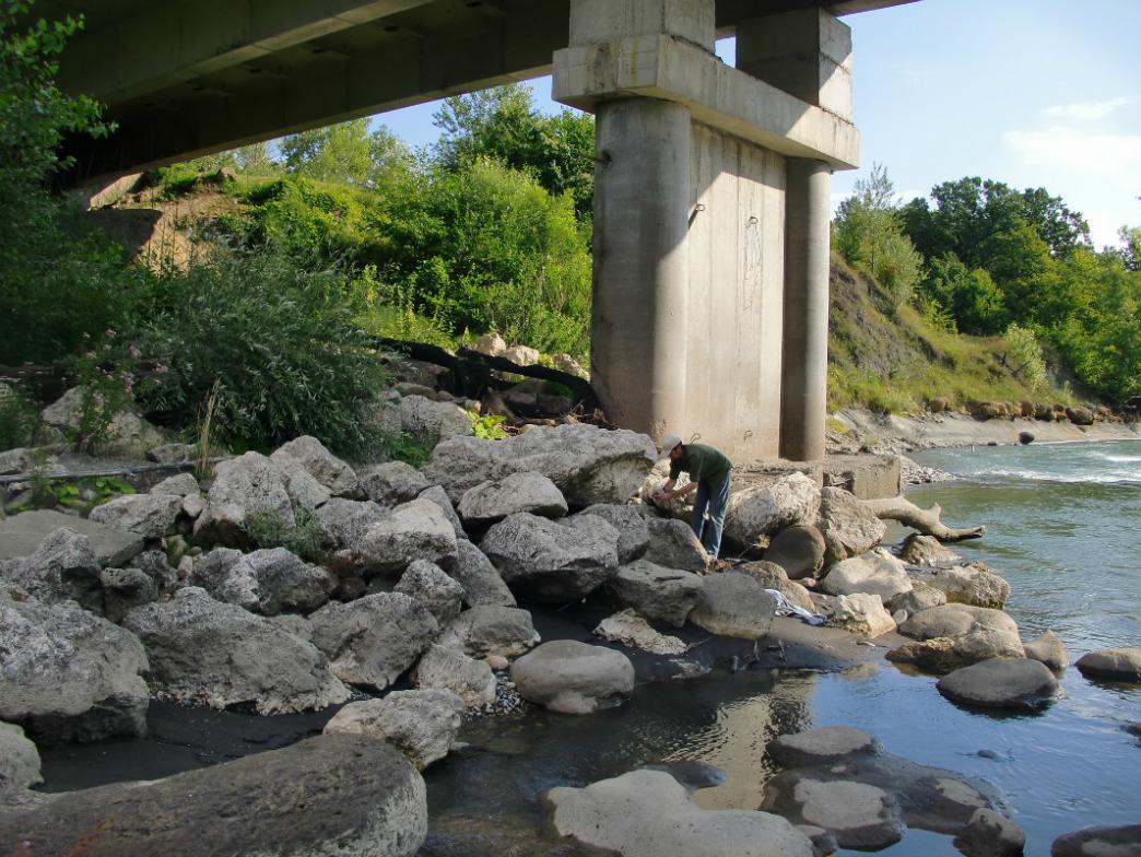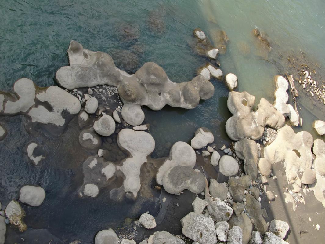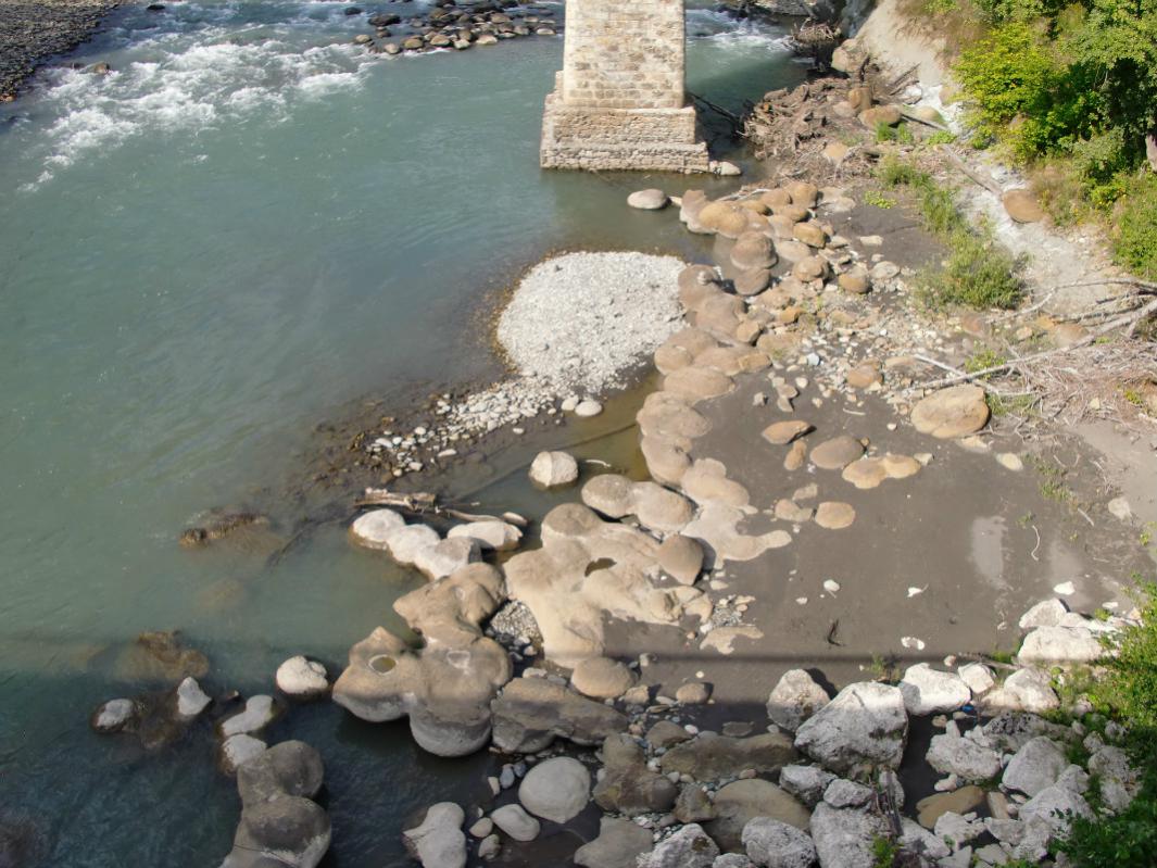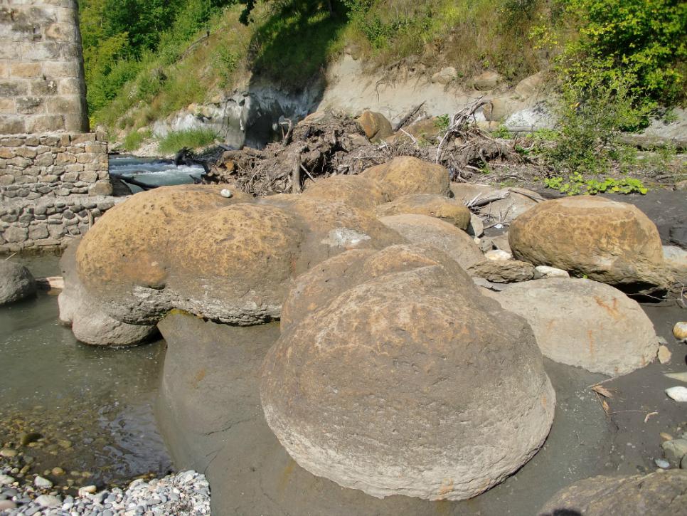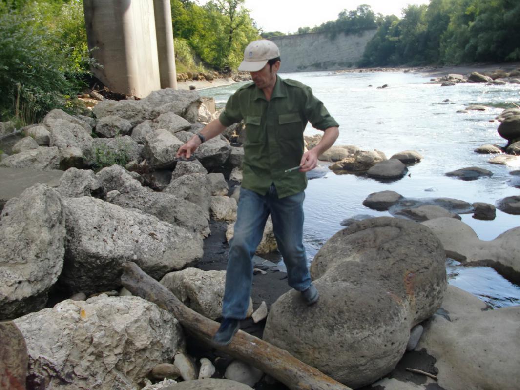 Погрузились поехали... С погодой нам повезло: тепло, солнечно, даже немного жарко. Дорога до Майкопа за разговором пролетела незаметно. Небольшая остановка. И далее до Ходжоха, он же Хаджох, он же посёлок Каменномостский. Незадолго до посёлка — мост через Белую, за мостом мы остановились и спустились вниз к реке. Именно там внизу, на дне и берегах реки, лежат глыбы известняка округлой формы — это гигантские аммониты, замещённые кальцитом. И это стоит посмотреть!