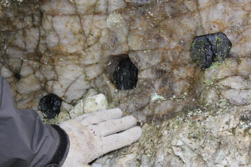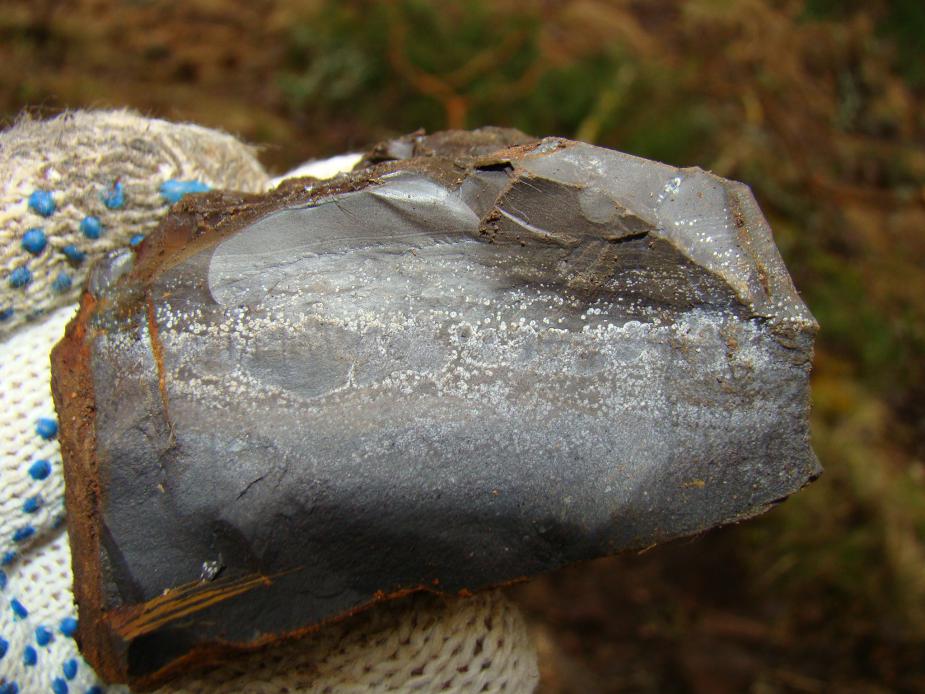 Следующим по плану пунктом были Сортавалитовые стёкла с острова Риеккалансаари. Они приурочены к контакту (зоне закалки) между габбро-долеритовой дайкой и гнейсами. Мощность этого контакта варьирует от 0.5 до 4 см, нам удалось обнаружить контакт около 1 см. Породы сильно затронуты выветриванием, извлекать сортавалитовые стёкла было довольно сложно, потому что они буквально рассыпались на глазах.