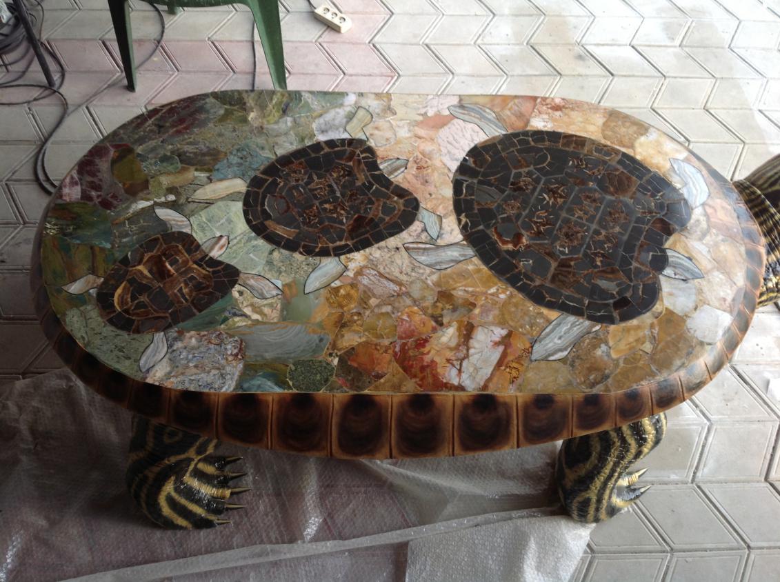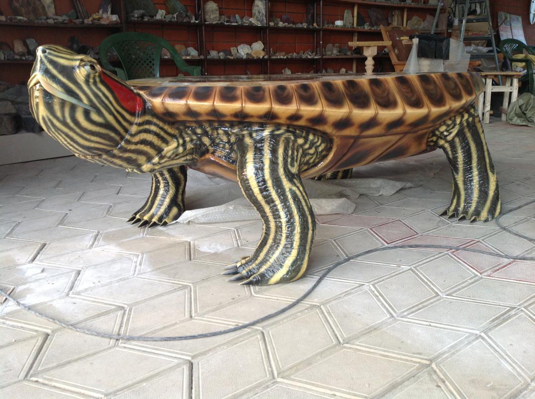 В Горячем Ключе живёт замечательный мастер и резчик по камню Владимир Борисович. Совсем недавно довелось увидеть одну из его новых работ — стол-черепаха. Размеры: длина 2 м, ширина 1 м, высота 0,6 м (яшма, агат, септарии; глаза — оникс и обсидиан).
