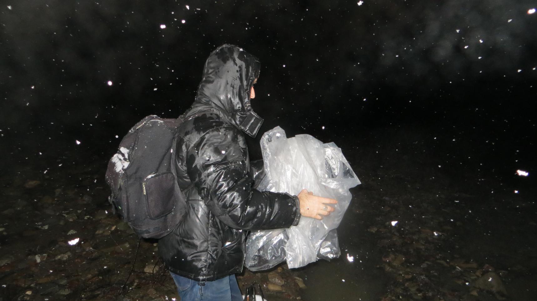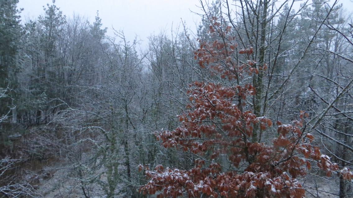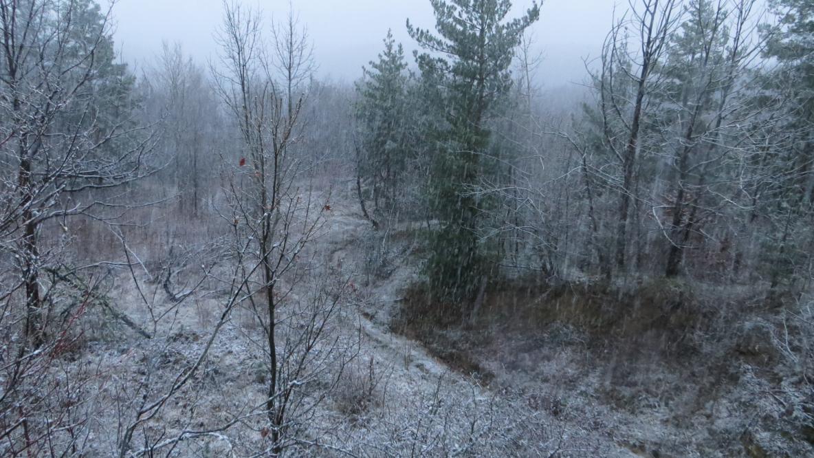 Примерно без четверти шесть, пройдя по низу карьера, где грунт от воды местами превратился в сель, преодолев пару раз настоящие канавы, вымытые водой, мы начали подъём по склону горы, чтобы выйти к бункеру, только с другой стороны. Вроде бы не так далеко, метров сто-сто пятьдесят подъёма. Но там много поваленных деревьев, и тяжело идти по скользкому оледенелому склону, присыпанному снегом. Честно говоря, я пожалел, что не стали возвращаться по тому пути, по которому вышли на карьер.. Вымотались, да и упали по разу на скользком склоне и один, и другой. Предусмотрительный Алексей взял с собой небольшой термос с чаем, это очень здорово выручило. Наконец вышли к бункеру и начали спуск. Алексей, как лирическое отступление после наших мытарств, пока было светло, сделал несколько фоток природы.))) Наверное, Сергей там внизу в лагере "рвёт и мечет", ибо уже стемнело, а нас нет... |