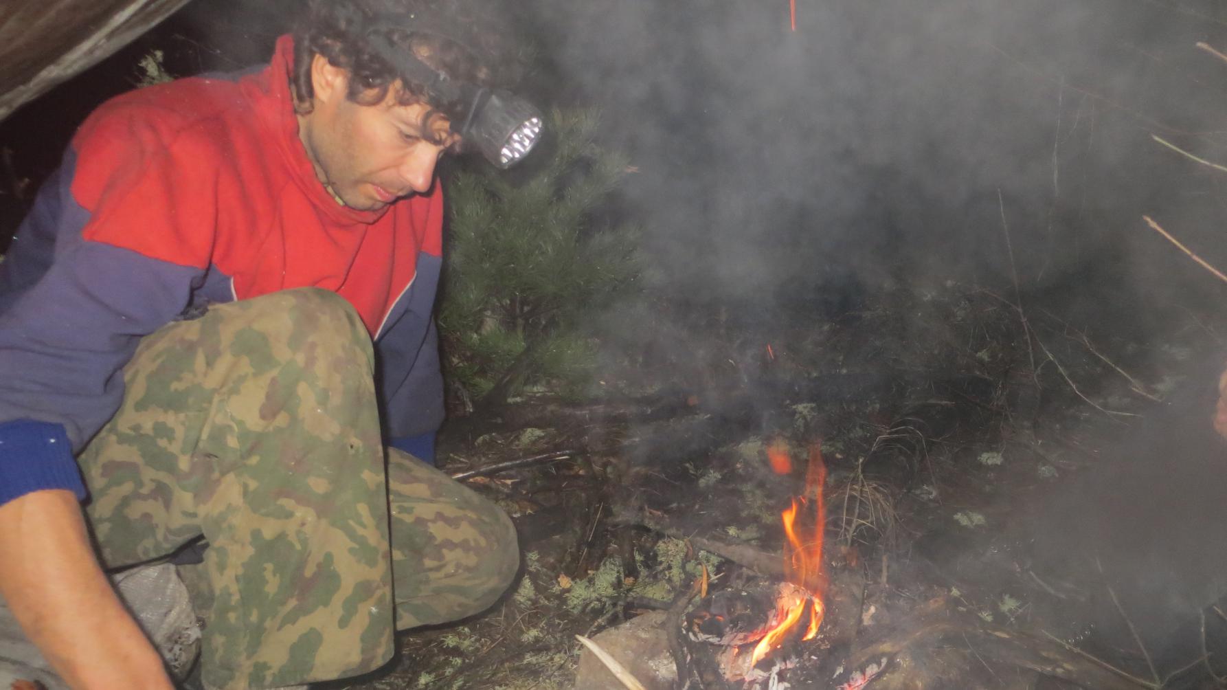 Перейдя реку, обулись. И подошли к лагерю. Сергей особо не переживал наше долгое отсутствие. У него в телефоне играли какие-то шаманские индейские барабаны... Похоже ему и без нас неплохо было — вёл себя как курортник на пляже.))) Мне почему-то вспомнилась песня группы "Ноль" — "Про настоящего индейца". Прямо в тему. Небольшой импровизированный навес из плёнки, костёр и горячий чай — вот всё что надо для полного счастья.))) Ноги после реки можно погреть над огнём. "Нам лижут пятки языки костра..." (мотив песни напрашивался как-то сам собой)))
