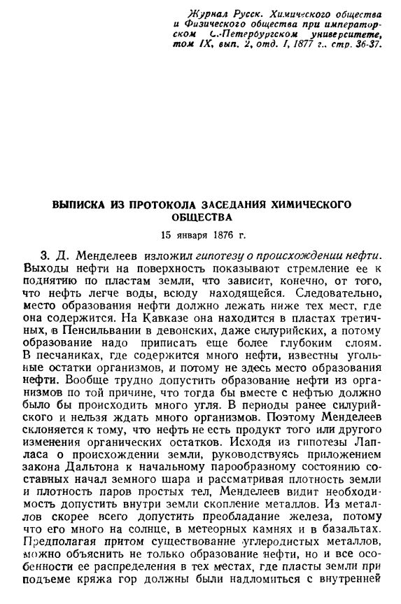 Выписка из протокола заседания Химического общества 15 января 1876 г., где Менделеев изложил гипотезу о происхождении нефти (Собрание сочинений Менделеева, 1949, том 10, с.14-15).
