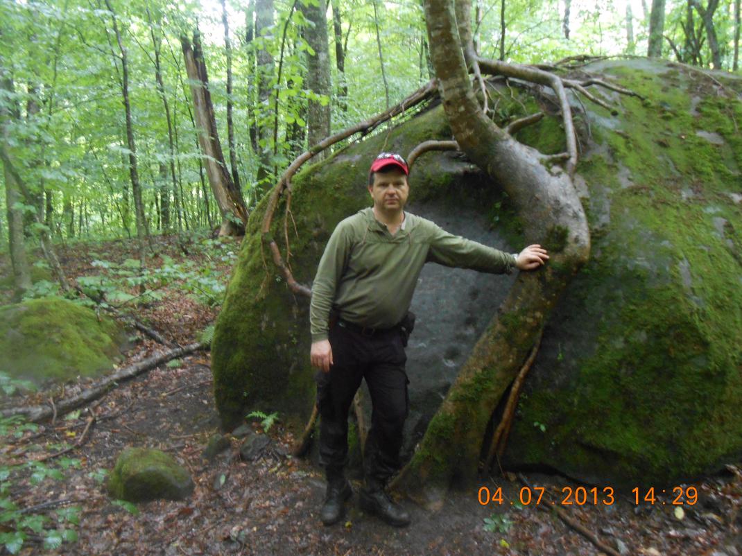 Двигаемся дальше. Тропинка постепенно огибает "сопку" — отрог высоты 1294 (она справа). Идём по часовой стрелке зигзагообразно с подъёмами и спусками по хорошо натоптанной тропе. Выходим на ровную заросшую лесом местность с огромными глыбами песчаника. Слева от тропы будет камень с растущим на нём деревом, корни которого спускаются вниз прямо по камню (ориентир). Хорошее место для отдыха. Ставим рюкзаки на камень. Делаем пару снимков на память))) До этого места идти приблизительно 1200-1500 метров.