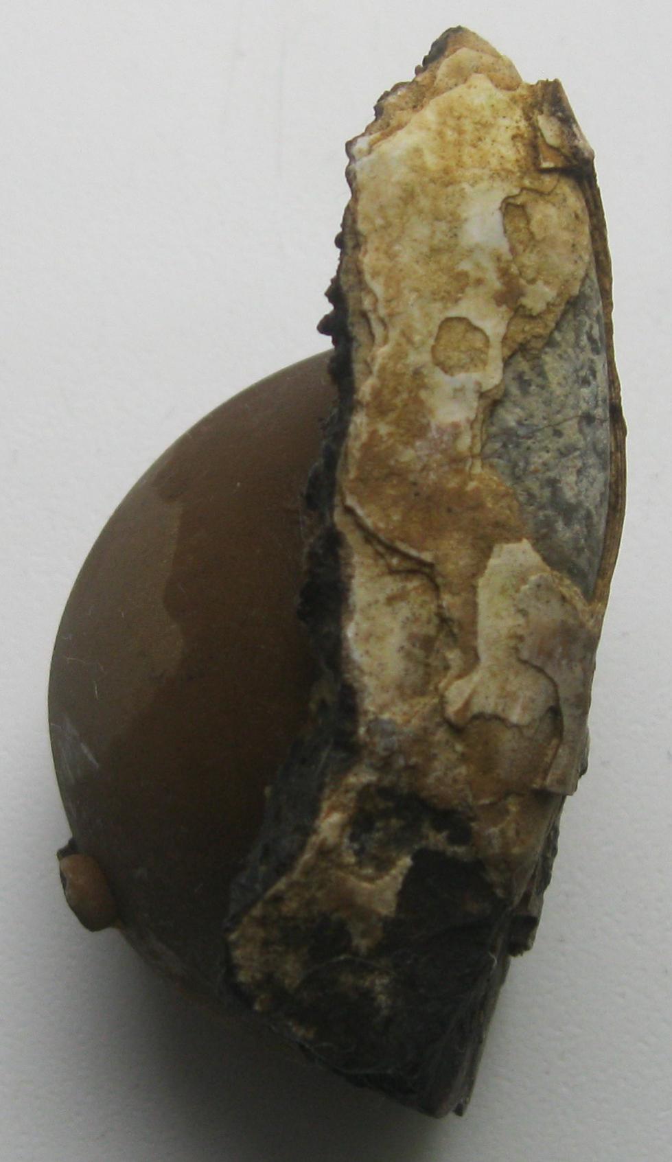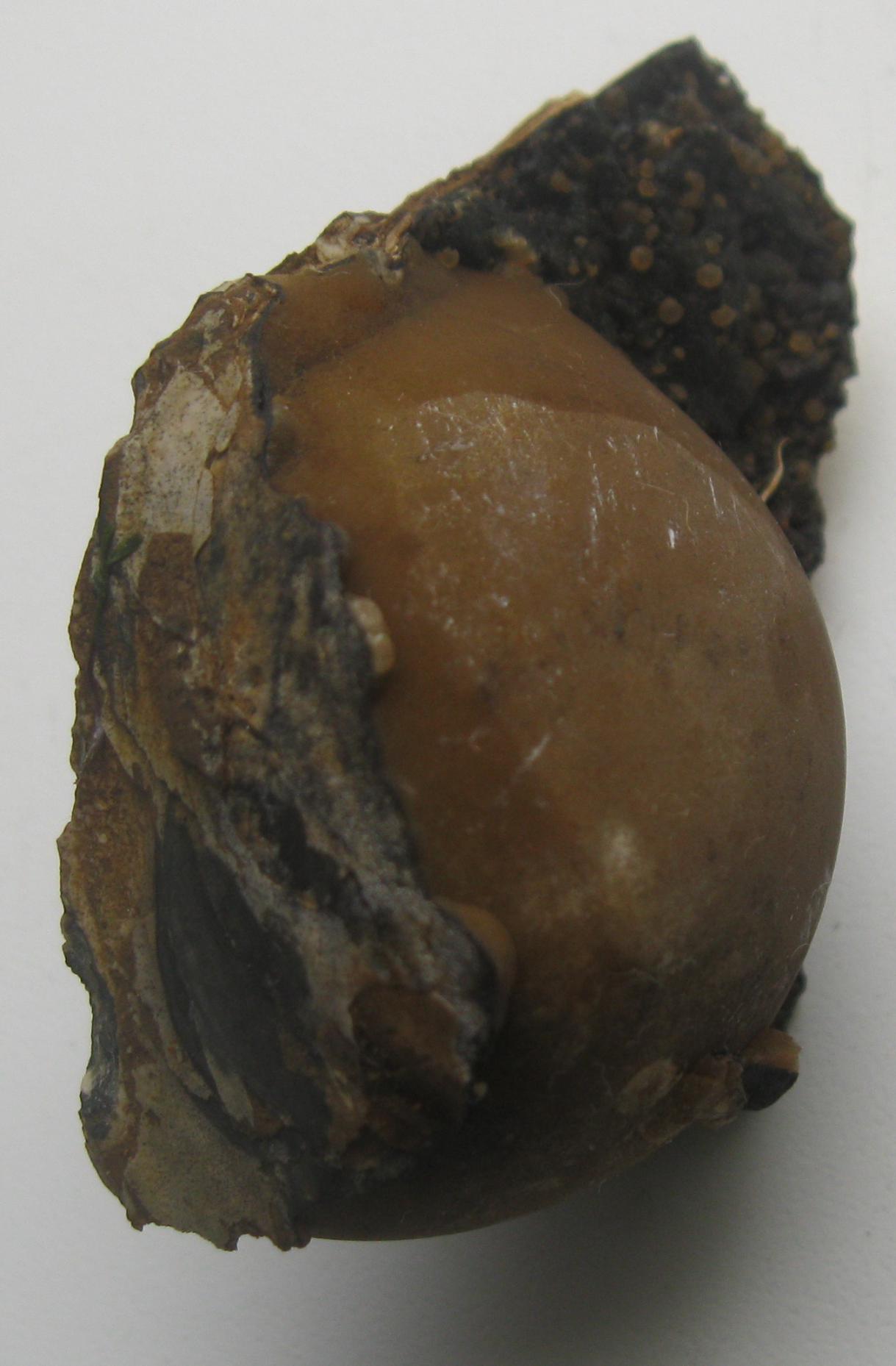 Подскажите, пожалуйста, что за сферическое образование во фрагменте морской раковины? И насколько это редкое явление? Образец найден на Керченском полуострове, на дне морского карьера. Размер овала 35х45 мм.