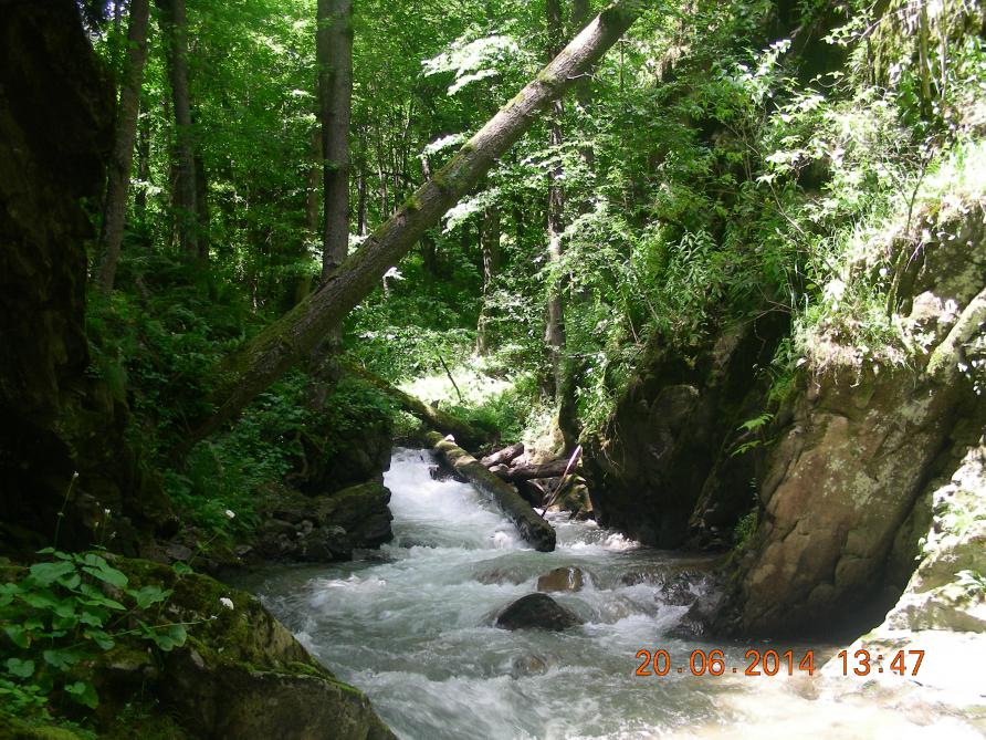 Что-то вы меня заинтриговали этими гранатами. Не то чтобы они мне очень нужны, но дело не в результате, а в процессе. В общем, собрались с духом и "мотанули" туда вдвоём на "пузотёрке"- "LadaGranta" на пару дней. Воздухом подышать, развеяться.)) Дорога оказалась не из лёгких, по крайней мере до Рожкао (23 км), но за Рожкао совсем беда. Без джипа внедорожника туда лучше не соваться, но мы как-то потихоньку доехали... На дороге много было джипов, люди ехали на Кислые источники (на самой границе с Абхазией), плюс лесовозы сильно портили кровь. Дорога узкая, и разъехаться проблема. К вечеру добрались, встали на ночлег у реки Большая Лаба за мостом.(Урочище "Верхнесолёновский мост") На утро занялись изучением ущелья Большого Блыба от устья в верх против течения. Много попадалось Серицита.