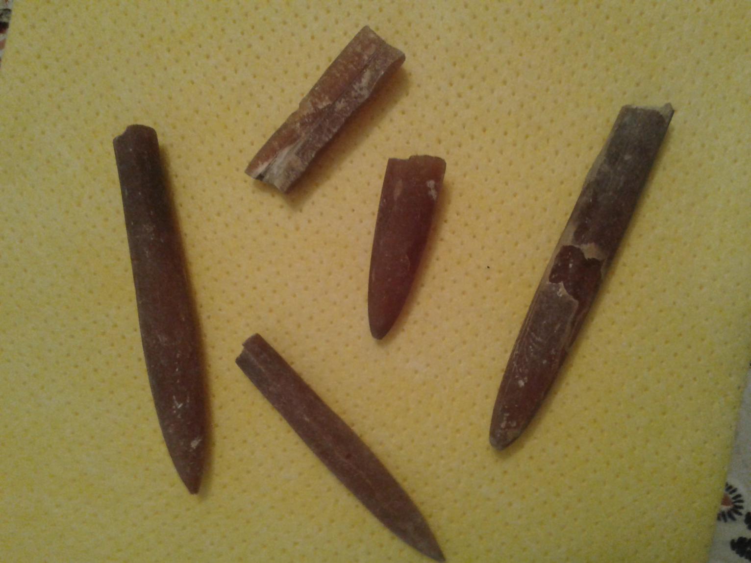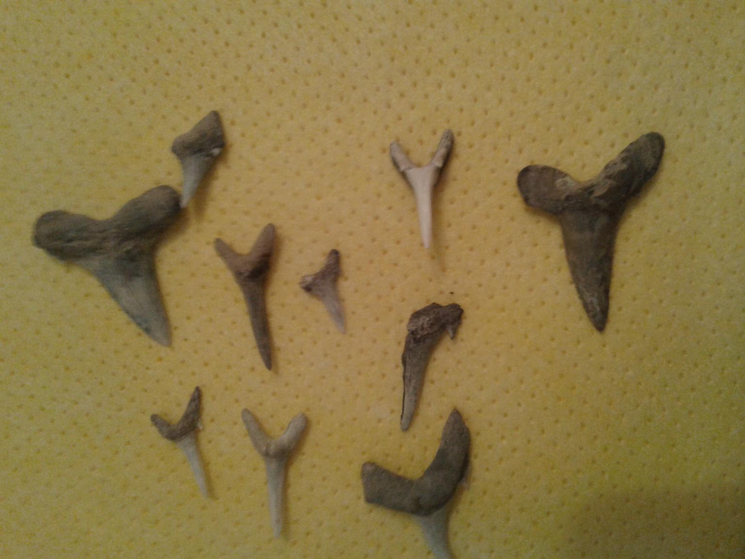 Зубы акулы. Последняя фотография - белемниты. А кристалл по фото непонятно, плохо видно.
