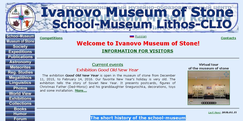 “exhibition is open in the Museum of Stone” “of Soviet New Year” — “of Soviet New Year traditions” “the homeland history lovers club” — “the Homeland History Lovers Club” [земля обетованная? :ag:] По принципу, не знаешь, как пишется “собака” — пиши “пёс”, замени “the field of our interests was expended to” на “the range of our interests was broaden to include” [знают ли те, кто писал русский текст, что геоморфология, минералогия и палеонтология являются составными частями геологии, а астроминералогия не имеет отношения к науке?] “the history of stone culture” — “the history of a stone culture” “received a building” — “received over 500 square meters in an old house” “funding 500 sq. m.” — “funding” “from Lake Baikal and Mongolia to the North Timan and the Khibiny Mountains.” вообще бы это выкинул, но раз тебе очень нравится возьми в скобки — “(from Baikal Lake and Mongolia to the North Timan and Khibiny Mountains).” [надеюсь монголы не будут это читать :ag:] “2014 - after removal in 2010 in a separate building and long repairs our museum was opened. On the basis of the school-museum began the realization of Educational museum centre of natural science. Our museum was inaugurated on December 2nd, 2014. It is open to the public from December 11th, 2015.” — “In 2010 our school-museum received an entire detached building and relocated there. In 4 years of extensive restoration efforts the school-museum began to function in this building. In December of 2014 the Educational Museum Centre of Natural Science project was started on the base of our school-museum. In December of 2015 the Museum of Stone was opened to the public again (it took a year to receive the appropriate license).” [по-американски Center, по-британски Centre] [Natalia Krisanova] “Pedagogic” (прилагательное) неправильно, надо “Pedagogics” или “Pedagogy” (существительное). Вероятно, по смыслу лучше Pedagogics, их же теории учат, а не практике. :ag: [Yulia Demina] “From 2015 she works in the school-museum as a teacher-organizator. Her interests and hobbies are regional studies, mineralogy, paleontology, tourism, the collection of stamps and calendars.” — “From 2015 she works in the school-museum both as a teacher of complementary education and an organizer of children’s leisure. Her interests embrace regional studies, mineralogy, paleontology, and tourism. She collects stamps and calendars as a hobby.” по-маленькому “the basis of life safety” — “the basics of life safety” |