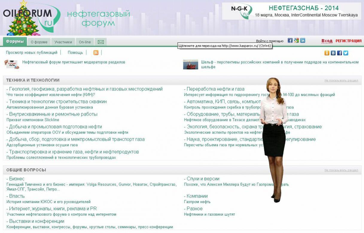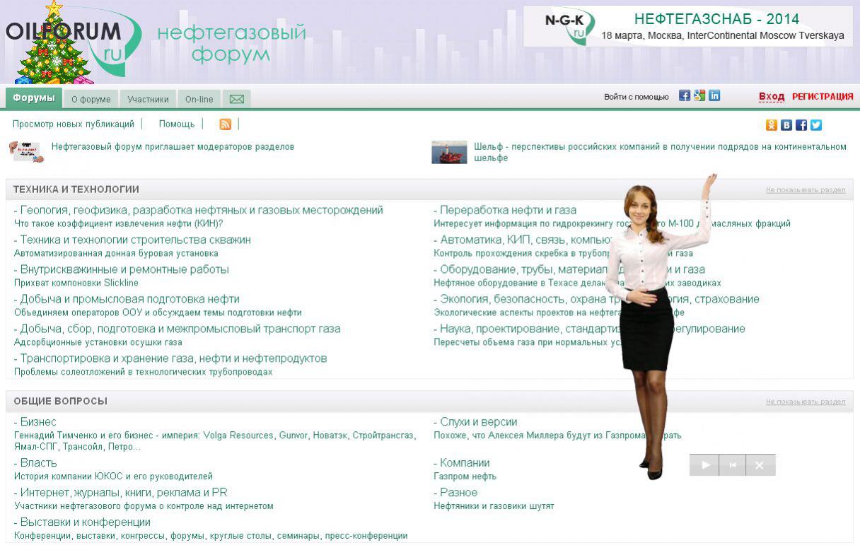 Зашёл на один нефтегазовый форум, а там сразу рекламный ролик: “Здравствуйте, рада приветствовать Вас на форуме нефтяников и газовиков. Здесь знакомятся с коллегами. Находят половых партнёров. Получают ответы на свои вопросы. Теперь у Вас есть возможность привлечь к обсуждению широкий круг специалистов из многих городов и стран. Большинство участников — профессионалы своего дела. В их числе руководители, использующие Интернет.