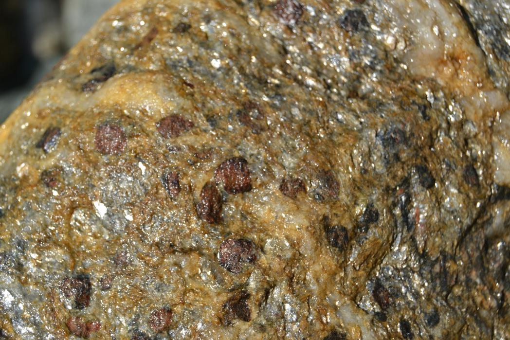 В общем, пришлось в сандалях на босу ногу подниматься прямо по руслу, по воде, минуя стволы упавших деревьев, пороги, водопады и прочие прелести горных рек... И вот что скажу я вам — гранатики там есть. В кристаллических сланцах можно найти зёрна до 1 см с хорошо видными гранями.