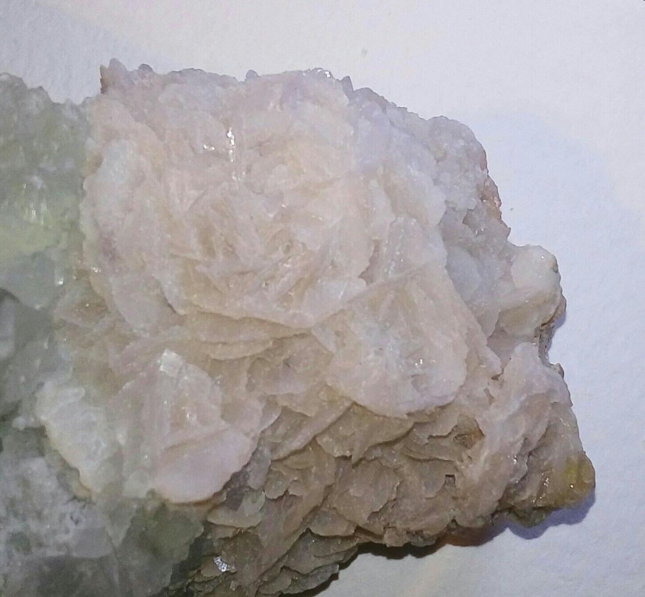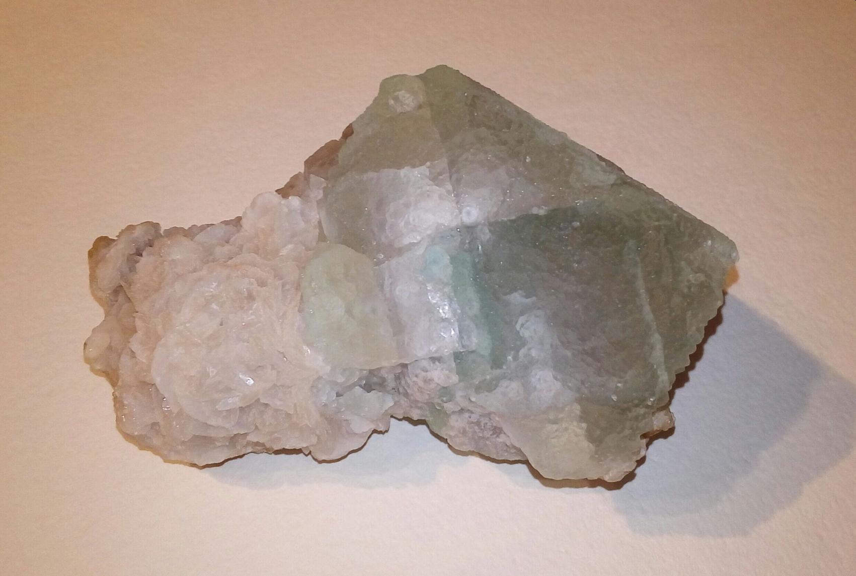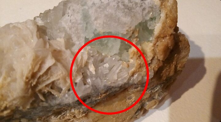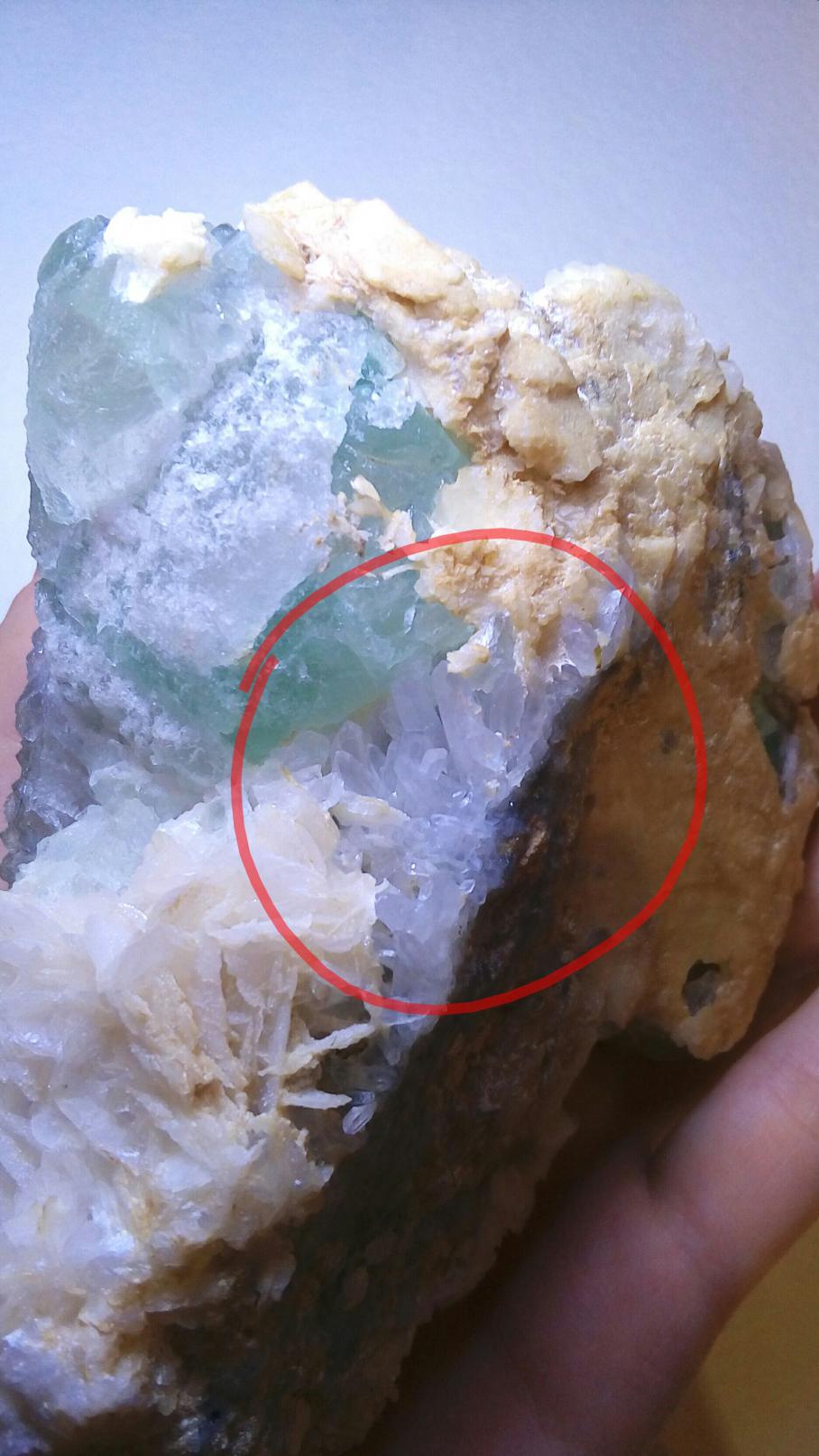 Уже несколько лет стоит на полке. Только сейчас захотелось про него узнать, но никак информацию найти не могу. Его мне подарили, поэтому сказать его происхождение я не в силах. У зеленоватого камня шероховатая поверхность. С одной стороны, которая находится постоянно в тени, бугорки маленькие, а та сторона что повернута к солнцу, имеет бугры побольше и поострее. Их форма напоминает конус. Сам камень не сильно прозрачный (мутный). Про приросший к нему белый камень ничего толком не могу сказать. Только то, что состоит он как бы из пластин. Те, которые обведены в красный круг, выросли совсем недавно и продолжают понемногу расти. Описать я их могу только как: белые, мутные, вытянутой формы. Надеюсь, что это как-то поможет. Заранее спасибо. |