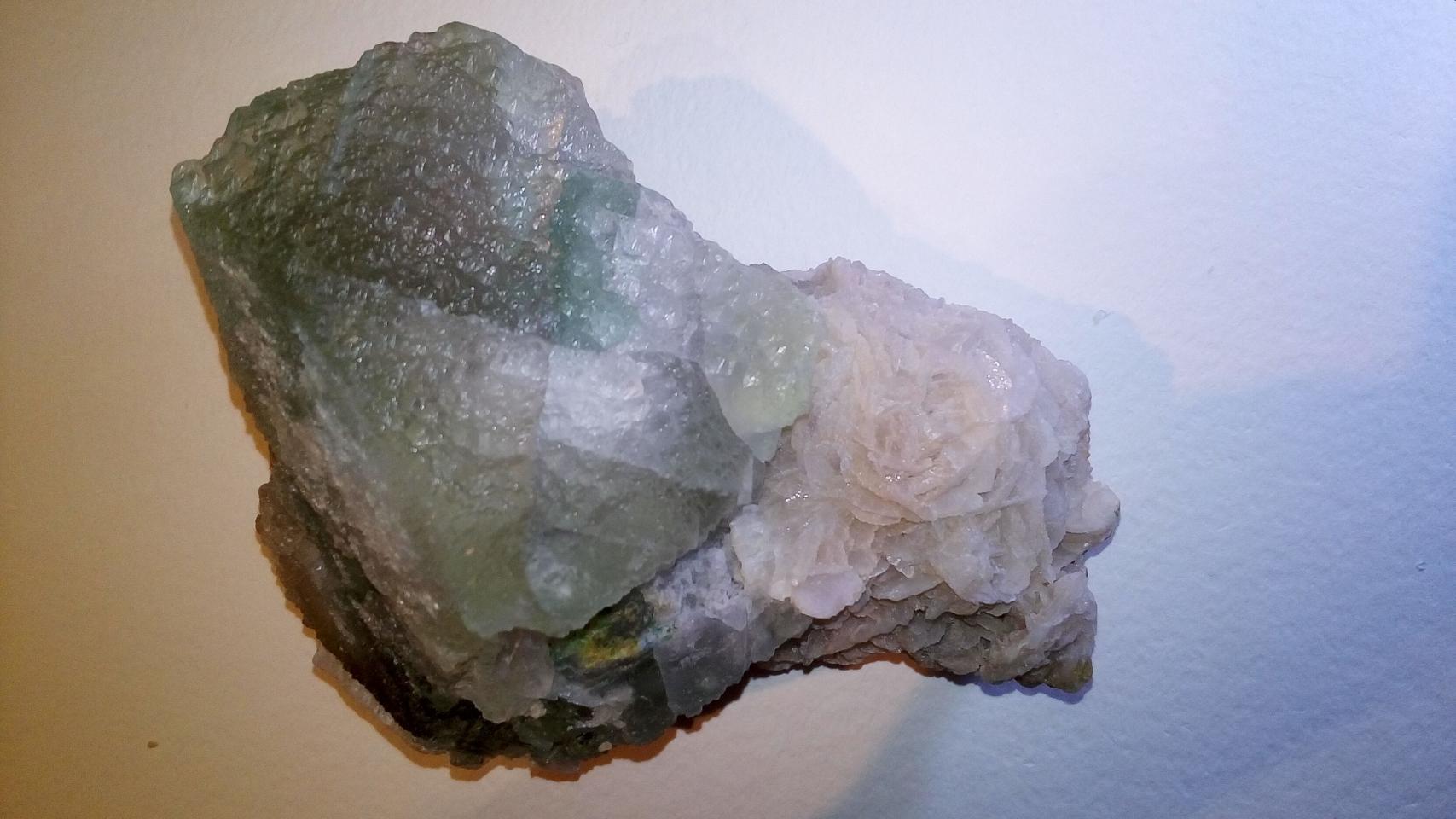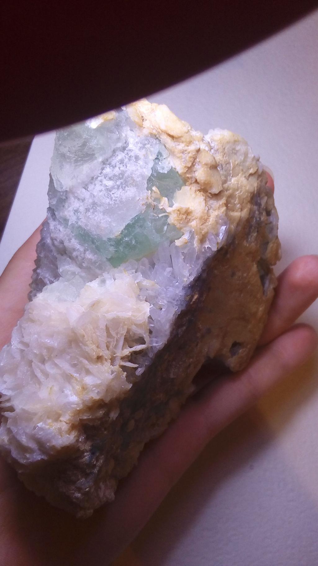 Зеленый кристалл - это флюорит. Желтоватые кристаллы - это кальцит. Белые (то что кругом обведено) - кальцит другой генерации или кварц, по фото не видно. Можете попробовать на твердость. Ели ножем царапается, то кальцит, если не царапается, то кварц. Месторождение - скорее всего Дальнегорск, Приморский край. |