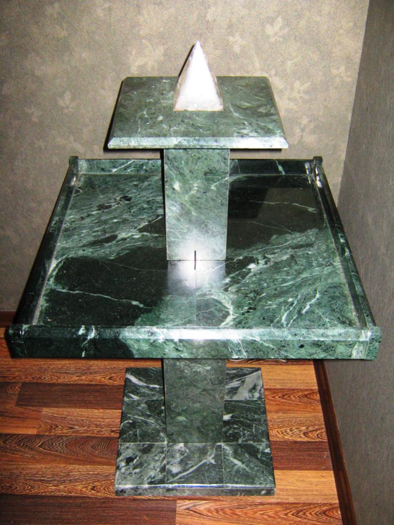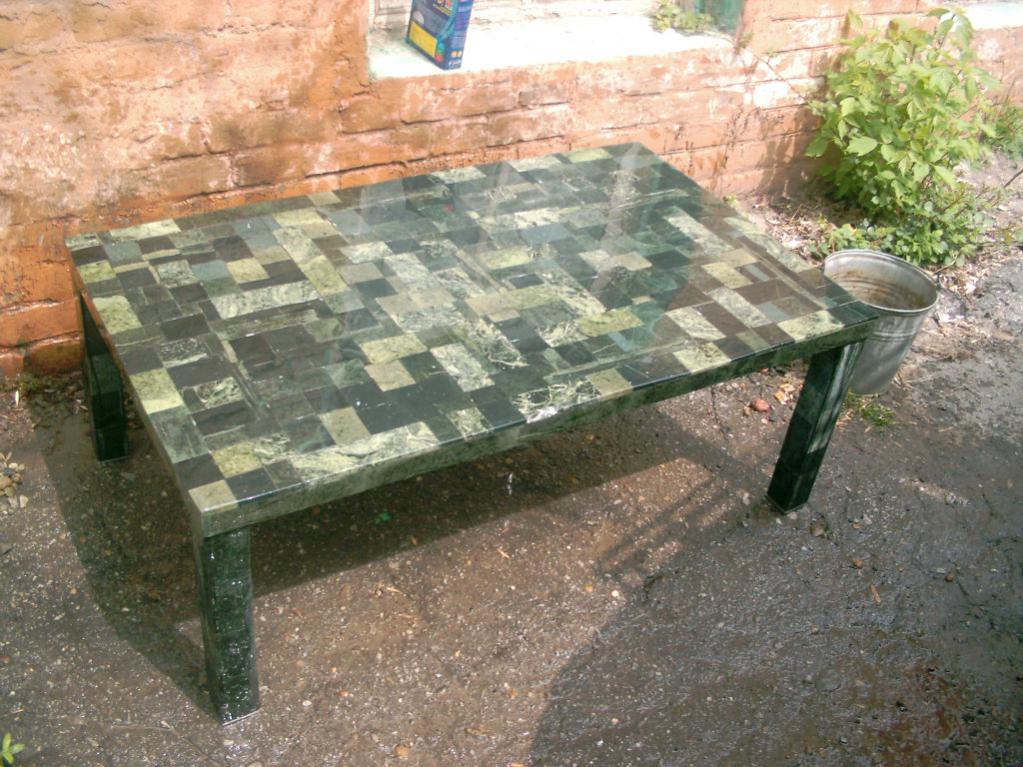 Другая его работа — журнальный столик, тоже из серпентинита. Обратите внимание, крышка стола буквально "набрана" из различных кусочков этого поделочного камня.