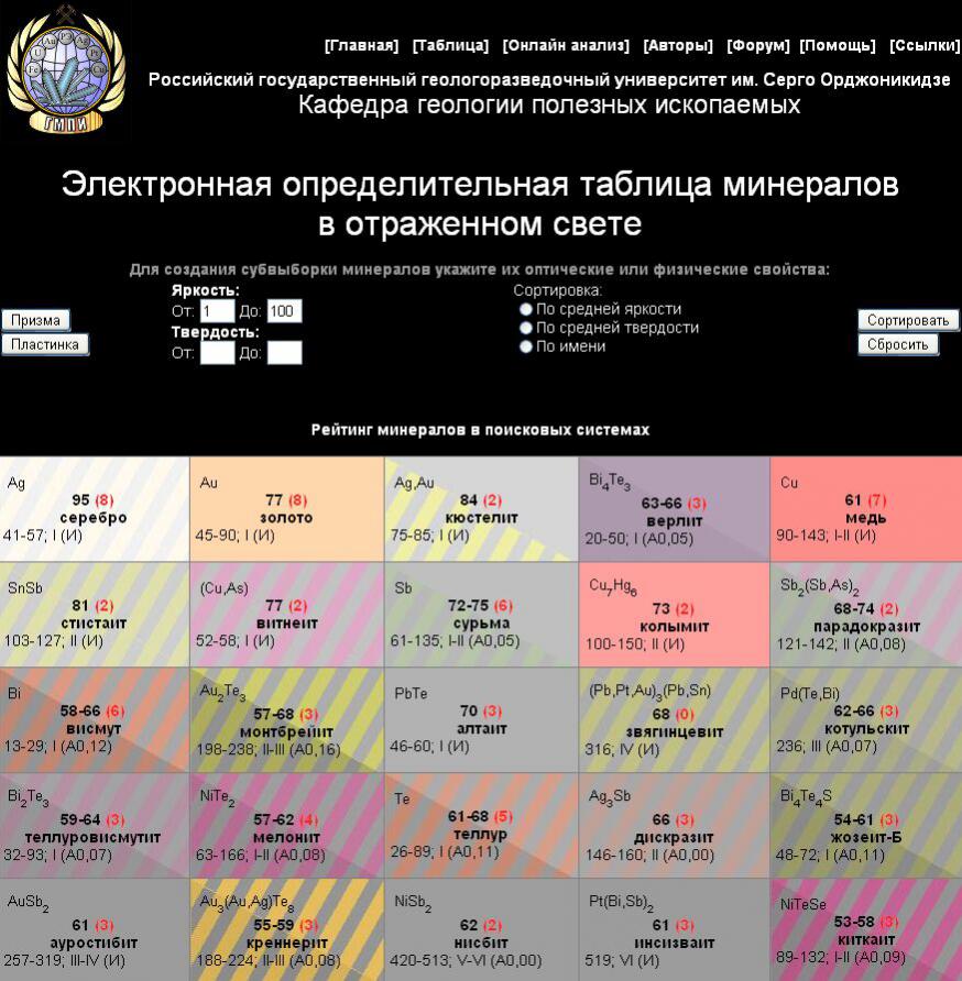 На сайте МГРИ есть замысловатая “Электронная определительная таблица минералов в отражённом свете”. Пояснения к ней тут.