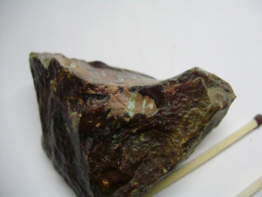 Сам камень напоминает кремень, не прозрачен, внешняя поверхность гладкая, чем-то напоминает оплавленную.