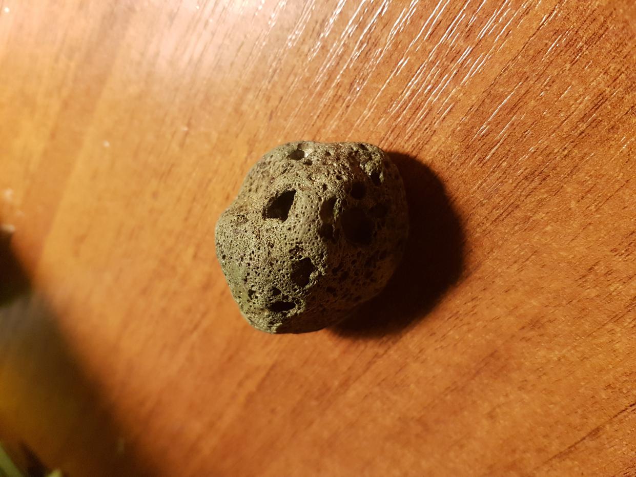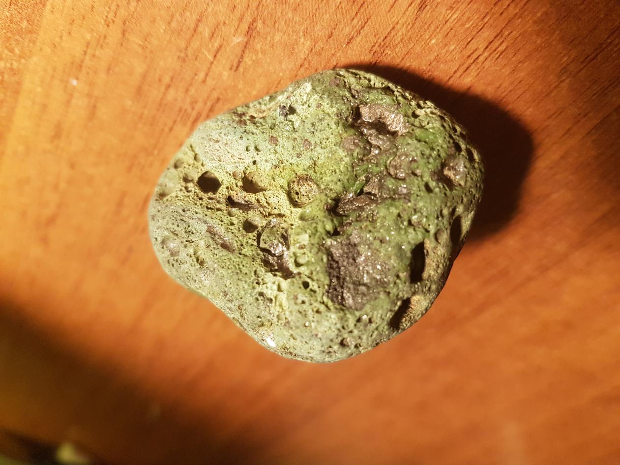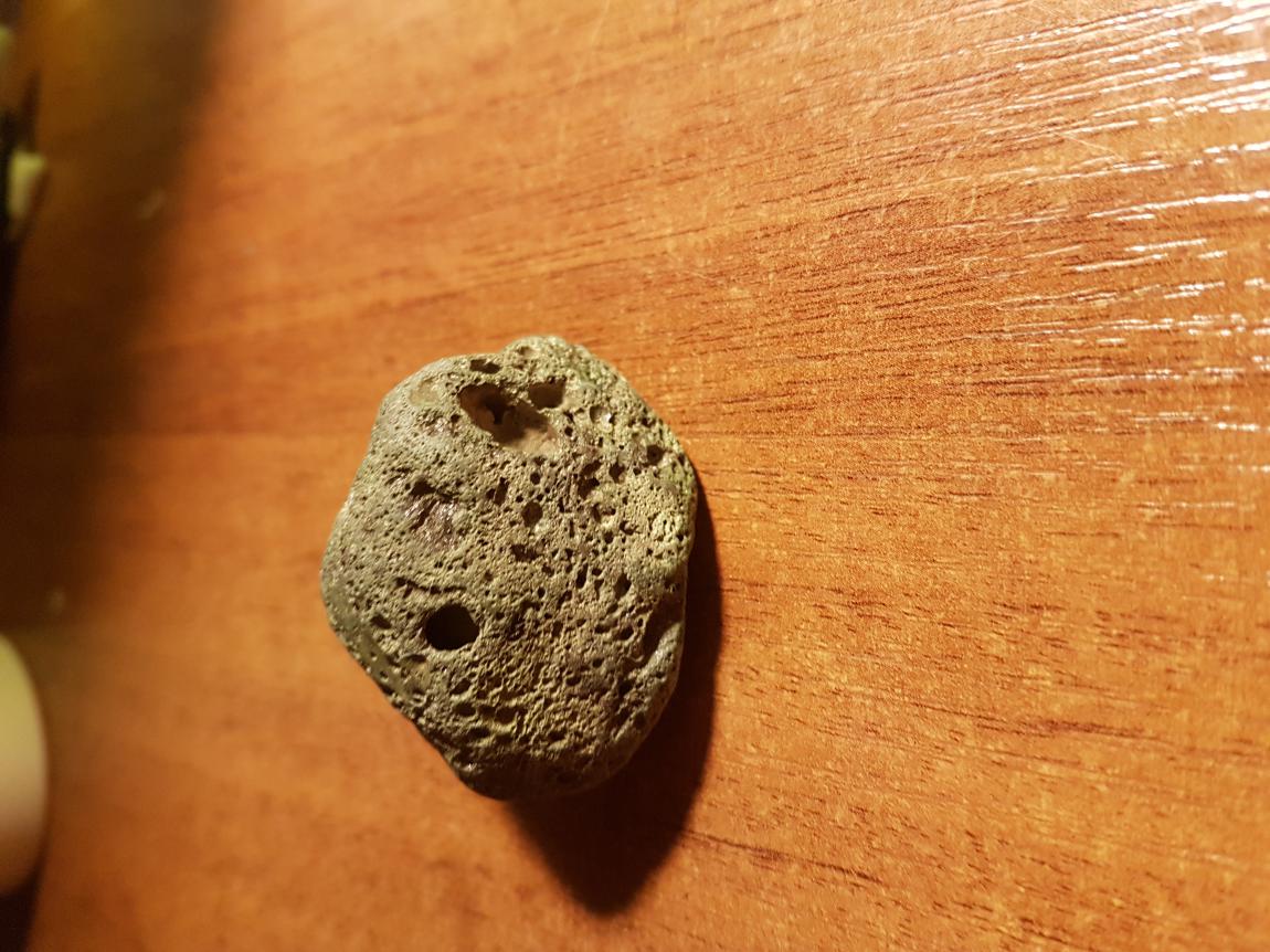 Нашел его на скалах у моря в Португалии, очень интересно, что это может быть. Внутри вкрапления из чего-то черного и блестящего. Буду очень благодарен за вашу помощь.