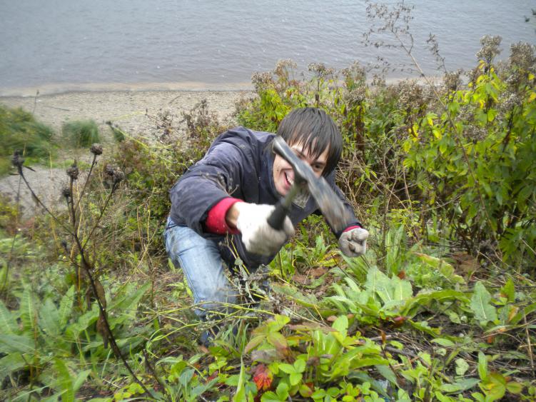 Наконец, когда у дождя лопнуло терпение, и он почти перестал лить, полезли наверх. Нарушая технику безопасности: отсутствие опоры на три точки — руки заняты образцами и молотками; гуськом друг под другом; без страховочного троса.