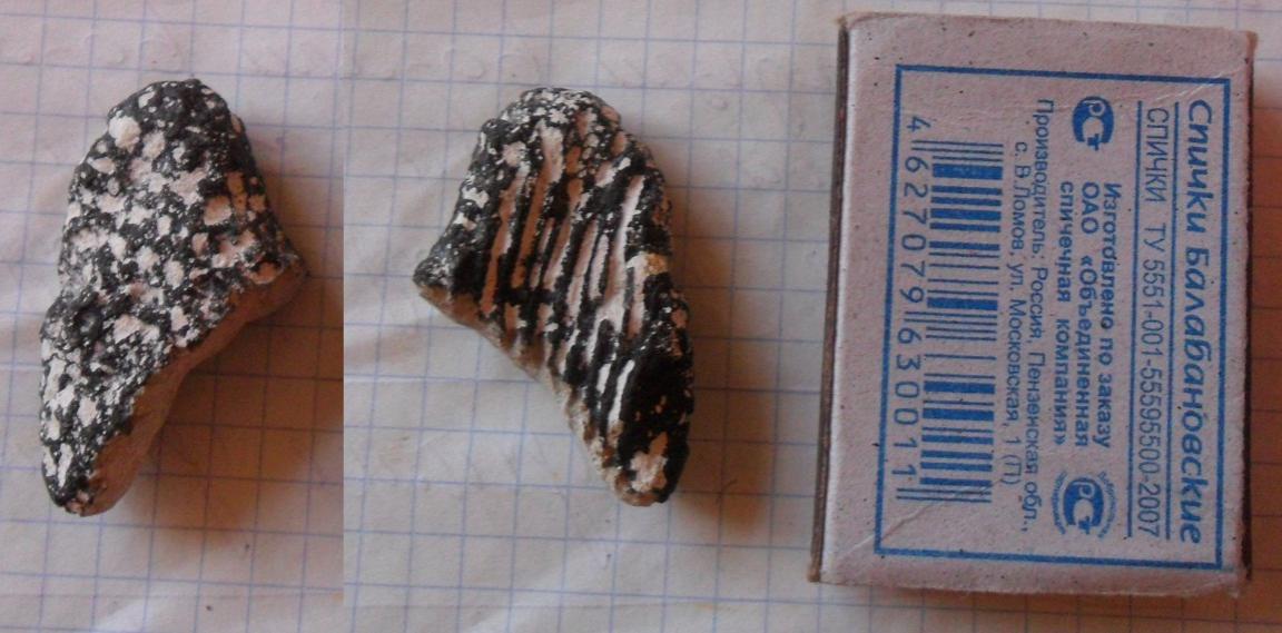 Думал, что это вообще продукт цивилизации, взял на всякий случай. Оказалось, это серый камень с черной поверхностью. С одной стороны в точках-ямках, с другой в полоску.