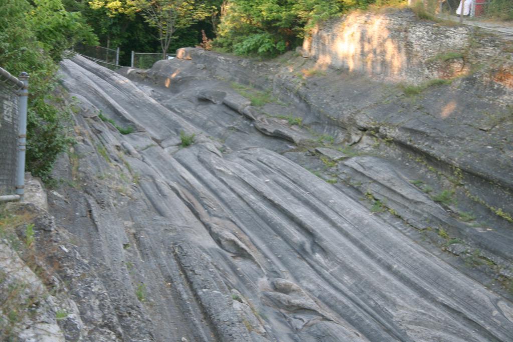 К горизонтальной плоскости царапающий предмет прижимает сила тяжести. А к вертикальной плоскости его ничего не прижимает. На "перуанской горке" видны слои пород(ы), а не борозды ледника. Если мы об одной и той же горке: