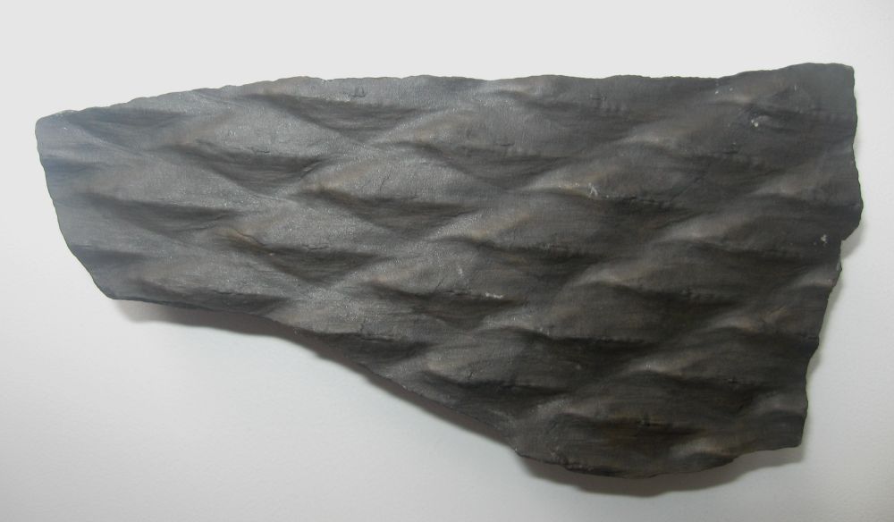 В Донецкой шахте на глубине около 600 метров среди угля и пустых пород попалась вот такая окаменелость. Подозреваю, что это окаменевшая кора дерева. Однако зубья коры находятся с обеих сторон пластинки, что как бы не вяжется с биологией. (Длина около 10 см, толщина около 1 сантиметра). Помогите бедному шахтеру разобраться с этой штукой, уж больно интересно.