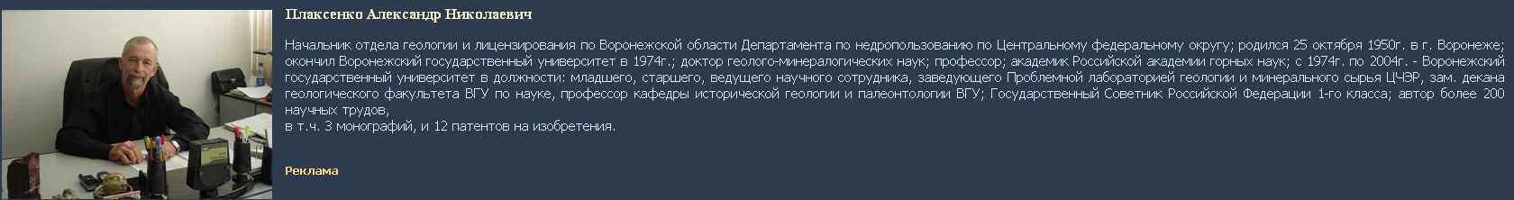 На сайте ВГУ (фото выше) написано, что Плаксенко — действительный член Российской академии горных наук с 1988 года (тогда такой ещё и быть не могло). Для придания академику пущей значимости буковку Г в и РАГН иногда опускают.