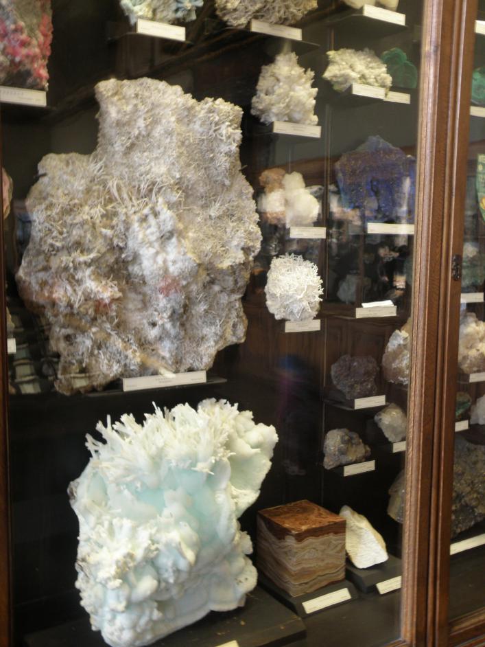 3. Та же полка "Арагониты" крупнее. Справа видна часть витрины, где выставлены азурит и малахит; видимо, там же и другие карбонаты.