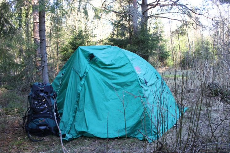 А вот и первая ночевка в лесу под г. Волхов. Шикарный сосново-еловый лес с мягким, как пирина мхом — замечательное место для отдыха.